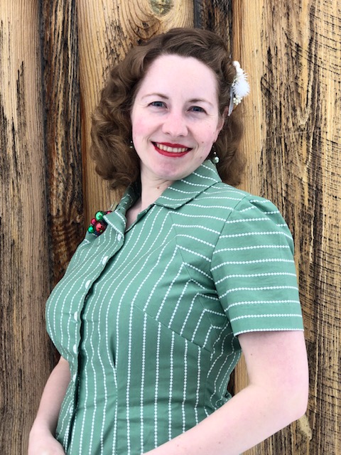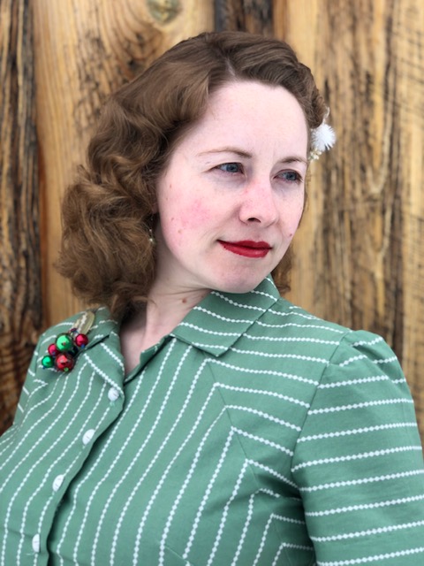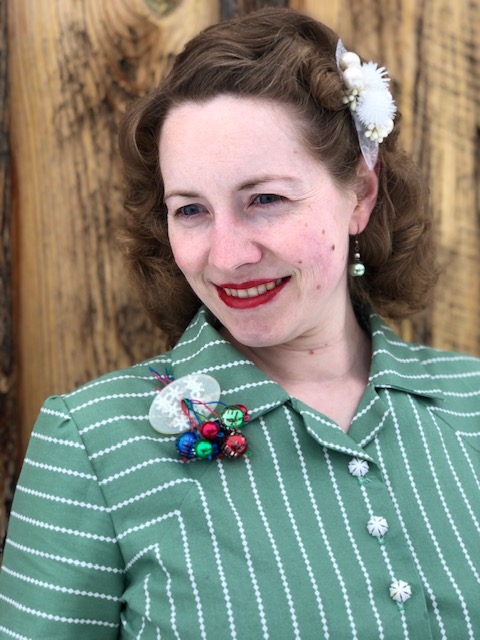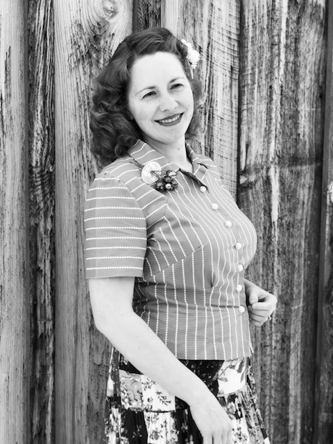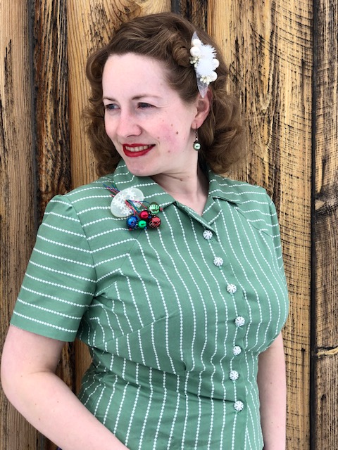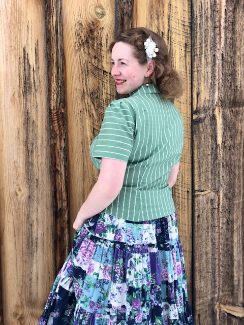 I got the fun 1950s blouse pattern a while ago specifically for the striped version with the shoulder yoke, and this fabric was ideal. I love how the stripes are actually tiny diamonds. This fabric is from the Poppie & Posey line, and a good example of how there is often a vintage-suitable print in the more modern quilting lines.