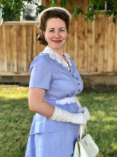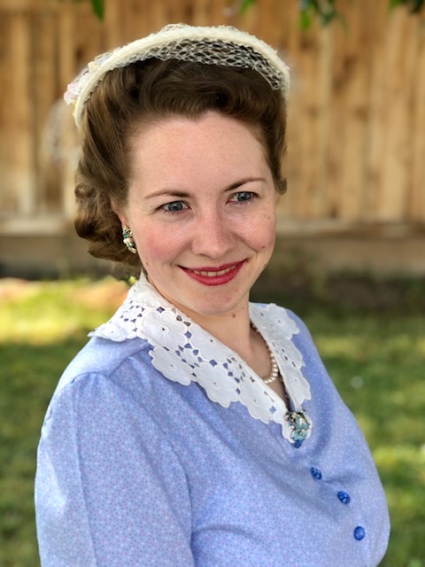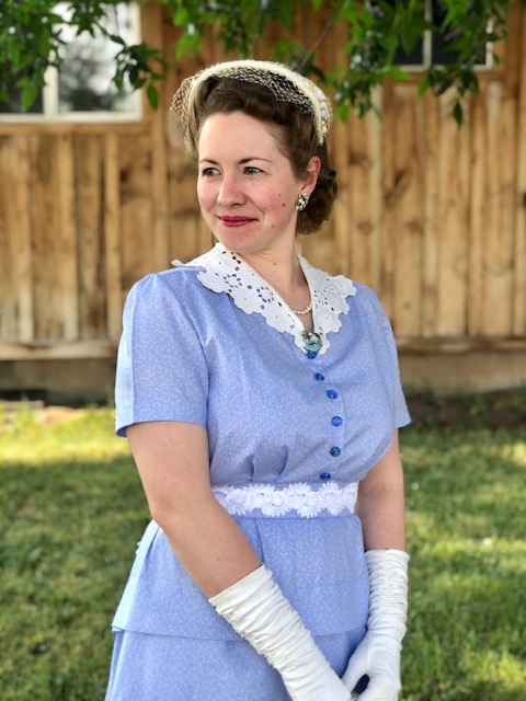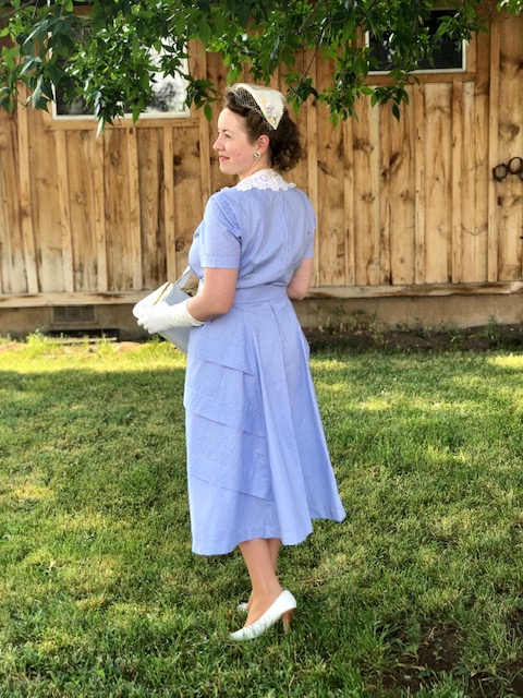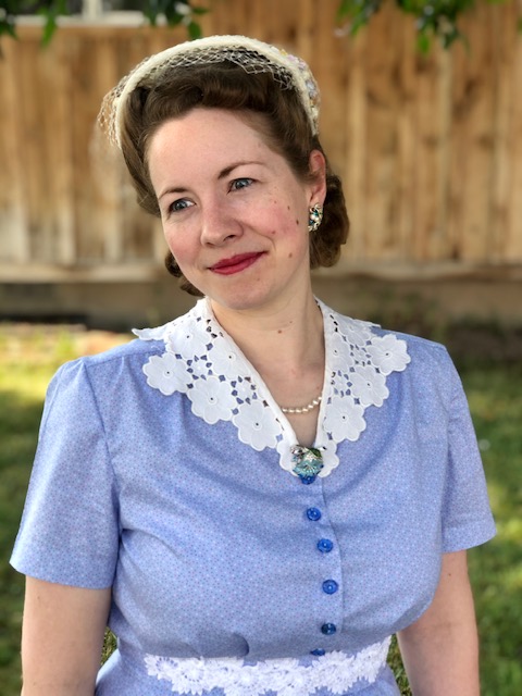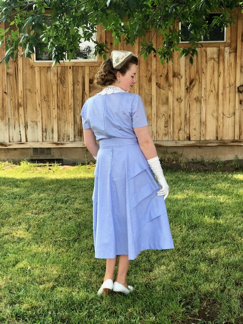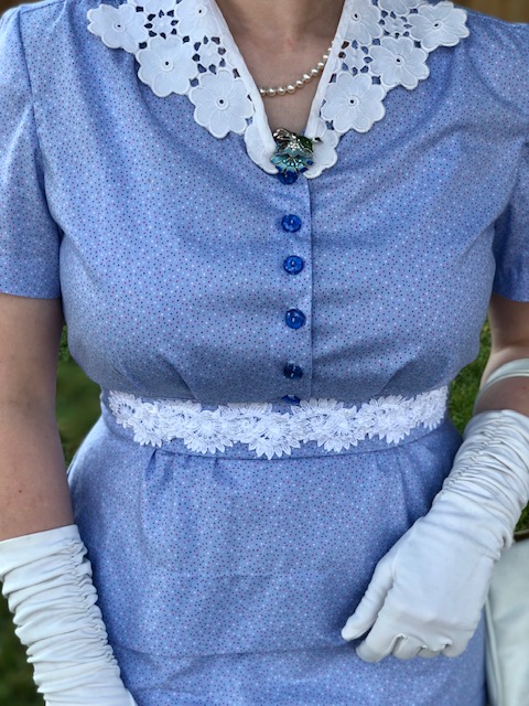 Instead of using the roll back collar on the pattern, I recut the front bodice to not only open in the front, but also trimmed off the collar part and made it a V neck so I could use some of my vintage collars.