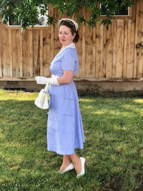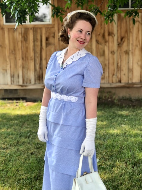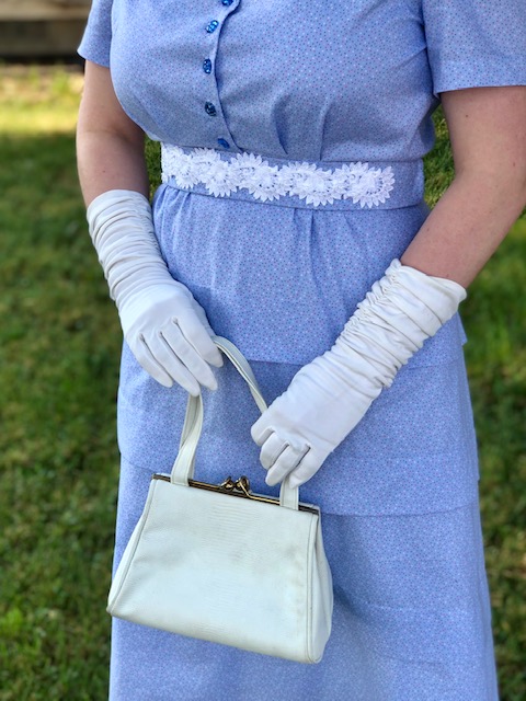 My very first version was made from a thrifted periwinkle sheet, with an embroidered border that I made into a belt. I re-channeled that same look with this periwinkle version, by making a floral belt that I embellished with 2 strands of floral lace overlapped and sewn down with seed beads.