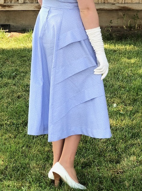 It's quite a unique construction, since the front skirt (in two horizontally pleated pieces) wraps around to the back darts, so there are no side seams in the skirt. And I just love the back details!