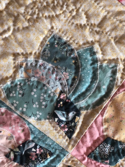 I hand quilted it, which went pretty fast. I wanted to quilt it as larger blocks of 4 instead of individual blocks, so after going around the petals and doing the decorative corner bracket, I added a few rows around the exterior.