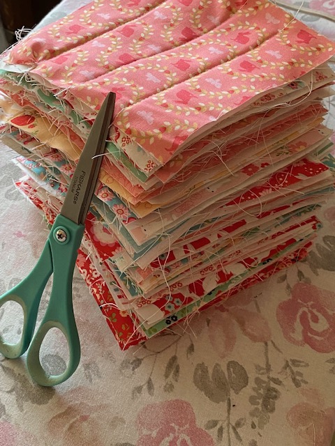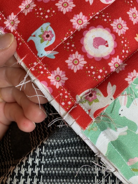 It is always difficult to remember after many years of sewing that THIS time you have to sew WRONG sides together! The backing squares need to be on the inside, and when you open the seam, the seam has to be on the right side. Feels totally backwards! I always get mixed up and need a seam ripper at least once. 🙂