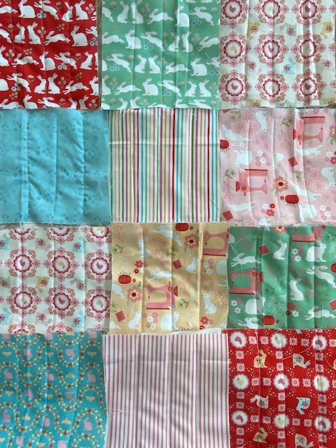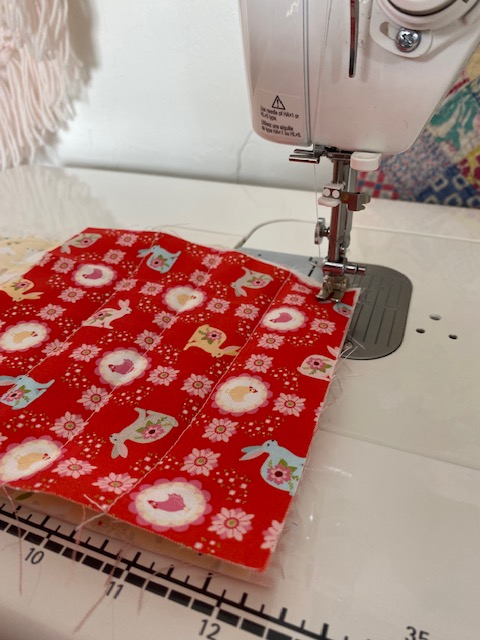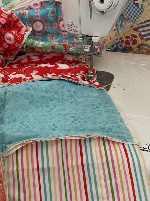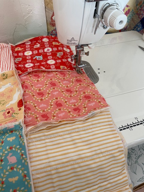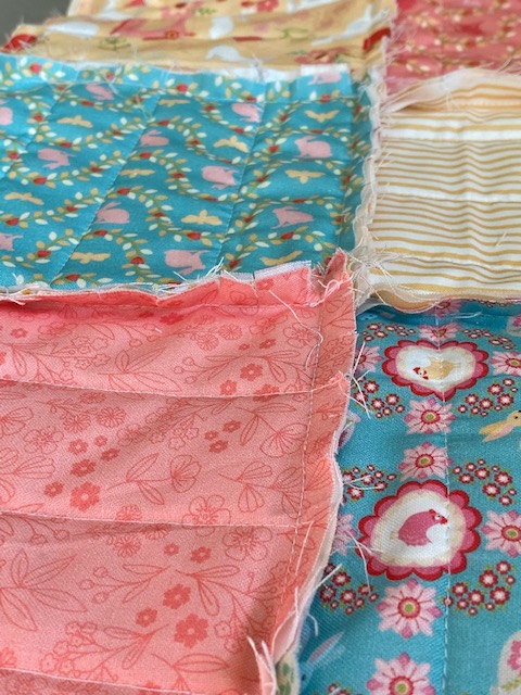 Once the rows are sewn, sew them together the same way – wrong sides together and the raw seam exposed on right side. You can nest the seams or sew them open – it doesn't matter.