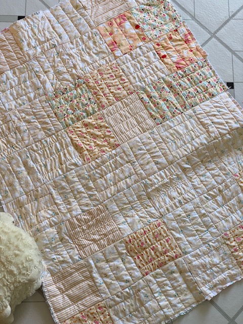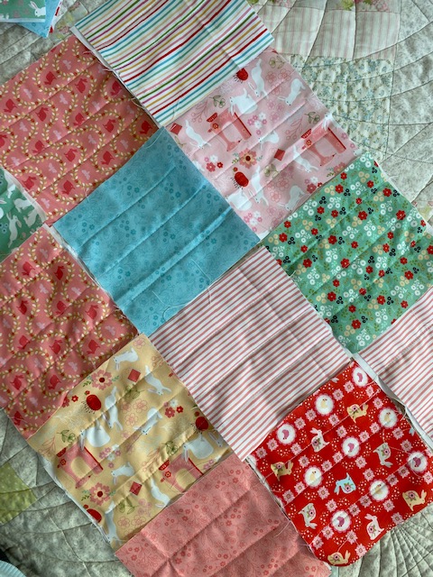My finished size is 30 x 40” – I used a layout of 6 x 8 squares cut at 6” but sewn with 1” seam allowance to subtract, so finish at 5”. It's a great size for a small child to drag around in the car or stroller. I'm sure it will get lots of use…and I love seeing this adorable fabric around the house!
