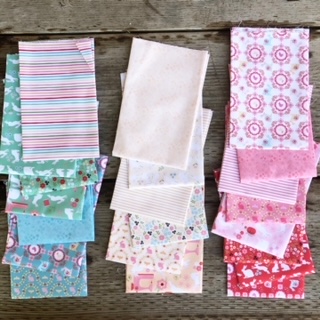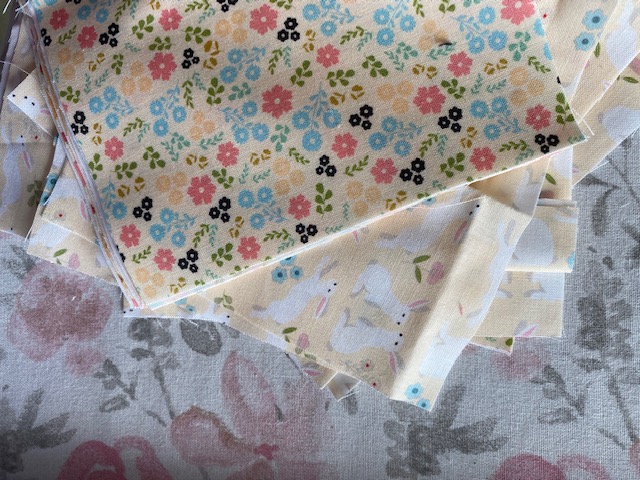 For this style of quilt you also cut your backing at the same time. You can use an old sheet, flannel blanket, or of course quilting fabric. Just keep in mind that the backing fabric will show through to the front at least a little bit. I decided to make a random patchwork back out of the ivory colors in this fabric line. (It's called Poppie's Patchwork Club, if you want to track some down.)