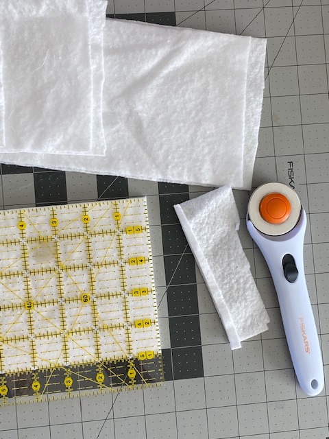 Next cut your batting squares. They need to be 1” less than your fabric squares. Since my fabric squares were 6”, I cut my batting squares 5”. This is a very handy way to use up smaller pieces of batting!
