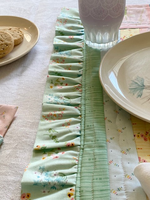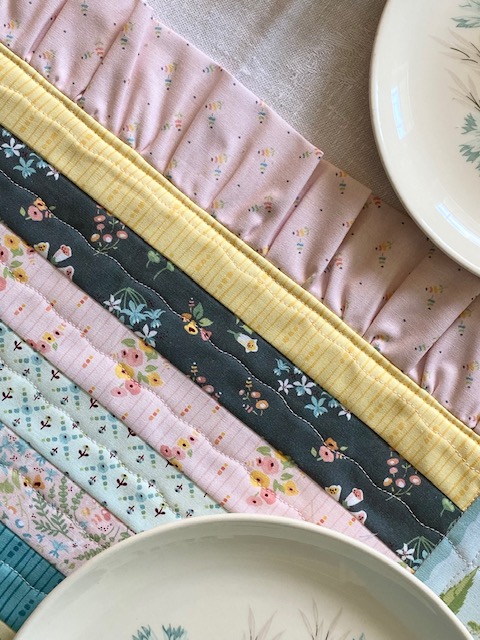 When the tote was finished, I wanted to play more with the panel possibilities, so I used a section of the panel and stitched it to a section of pieced strips to make a placemat. This didn't make quite a large enough placemat size, so I thought about adding a pieced border on the top and bottom, but then had the idea for ruffles.