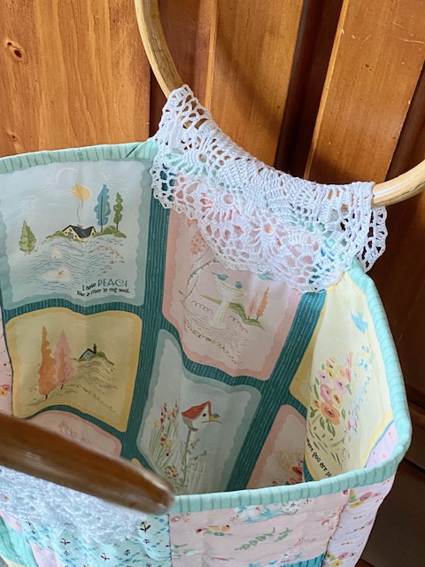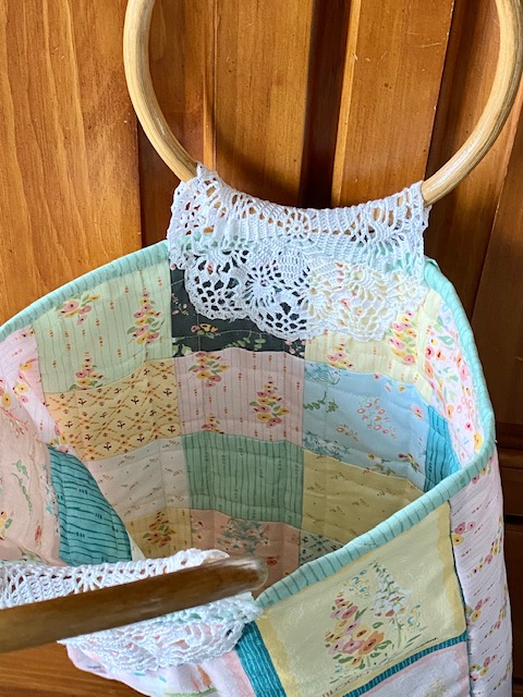 To make the handles also reversible, as well as add decoration, I used purchased round handles from my stash and sewed them down with a folded small doily. The doily halves make the perfect reversible handle holders, plus add pretty details.