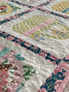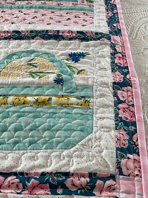 I joined the blocks with basic 1" sashing, and custom quilted it on my Juki sewing machine. I was pleased with how my free motion quilting skills have improved enough that I can like the result!