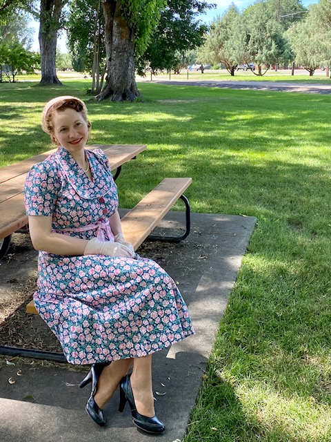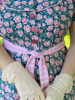 I made this from a 1950s pattern in my collection, only adding contrast piping and a tie belt in the pink gingham print. The tie belt can also double as a hair tie if preferred.
