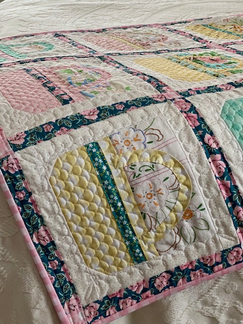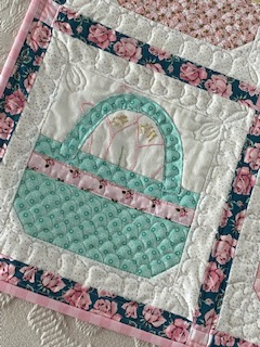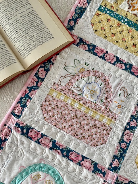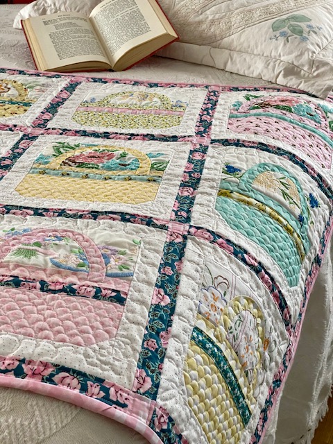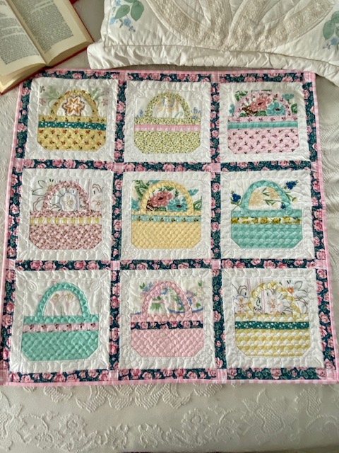 I took step-by-step photos of the basket blocks, so someday I may get around to sharing the pattern. Basic piecing, with a hand appliquéd bias handle.