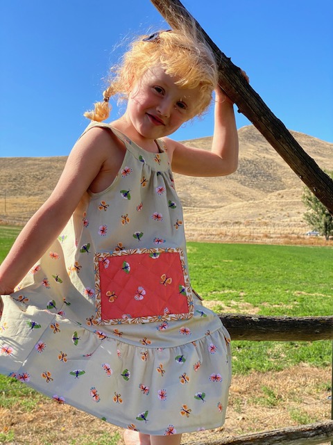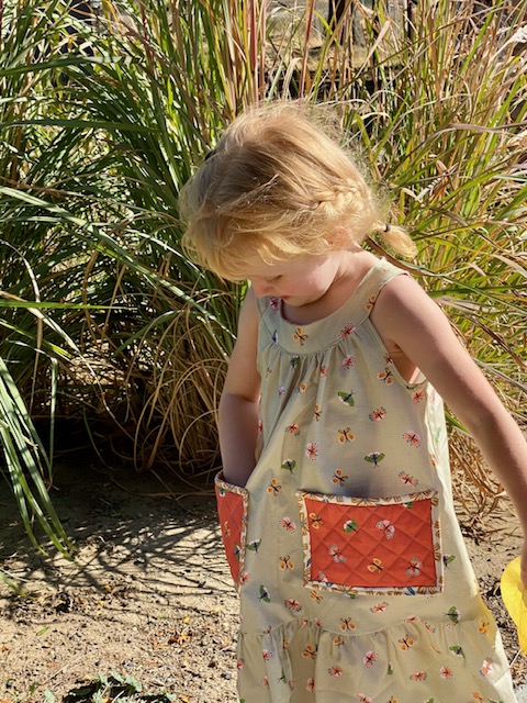 She LOVES pockets, so of course I had to add pockets. I had seen a photo of a vintage dress with quilted pockets once, so I decided to try it here. It makes them nice and sturdy for her, but also adds some fun texture.