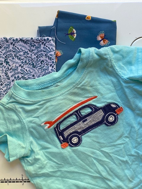 For the largest bag, I decided on the spur of the moment to save a cute little appliqué on a stained baby T shirt I was ready to throw away. I cut it out and top stitched around it twice on my bag panel – the colors go so well!