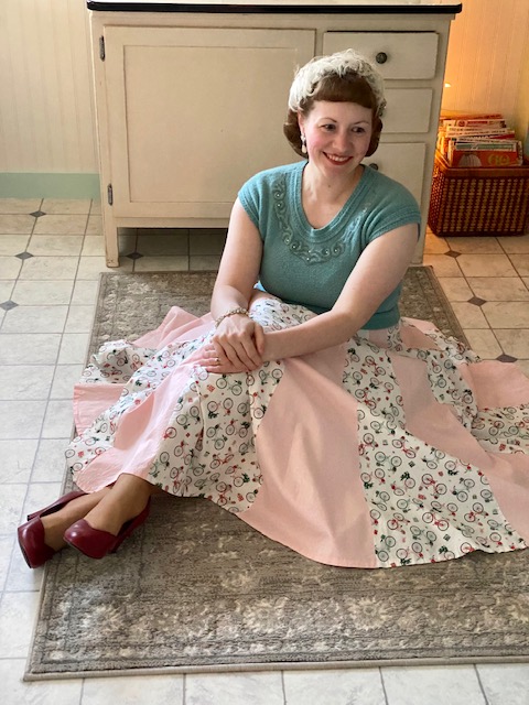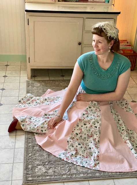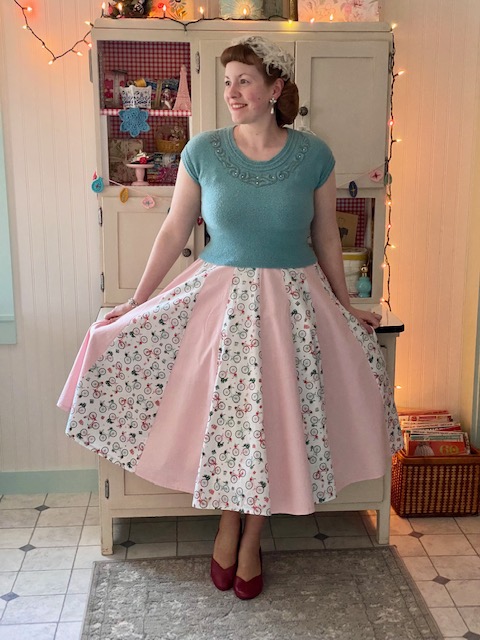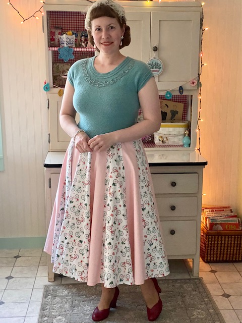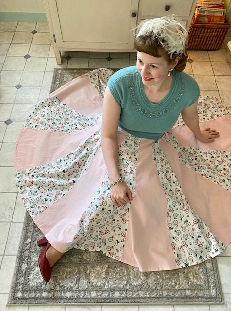 At first I wanted the alternating gores to be either mint green or dark green, but I didn't have suitable fabric, and also wanted it to coordinate with my aqua 1950s sweater (scratch the mint green idea). While I was waiting to go to the fabric store for a dark green, I suddenly wanted to make it in time to wear to a Christmas event in 2 days. Scratch the fabric store idea! I looked through my solids and found a pink that was the perfect match, and exactly the right yardage.