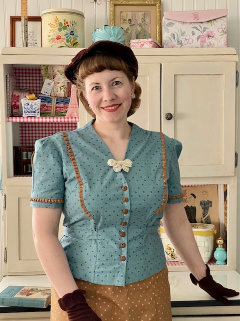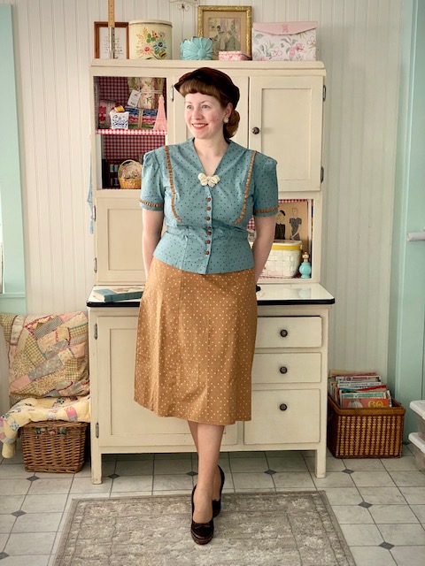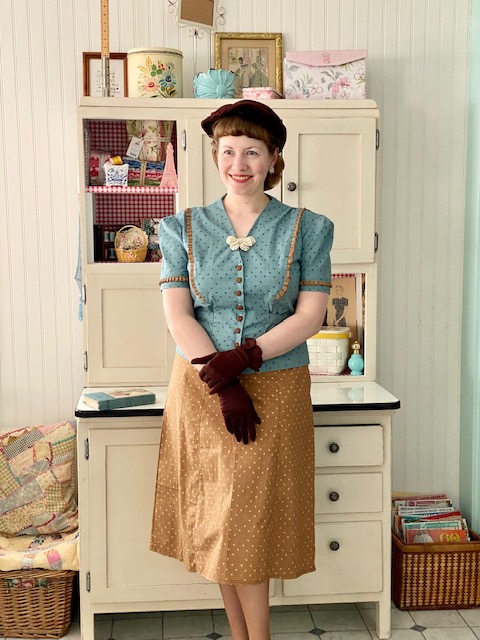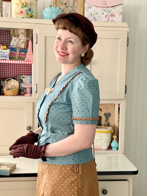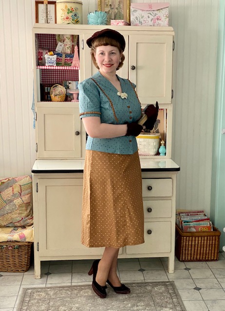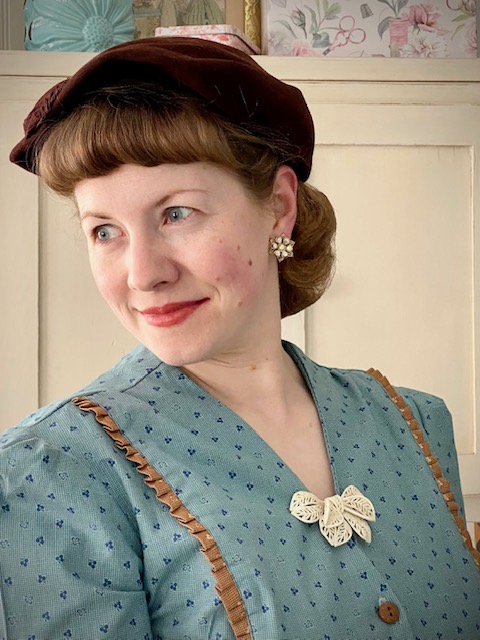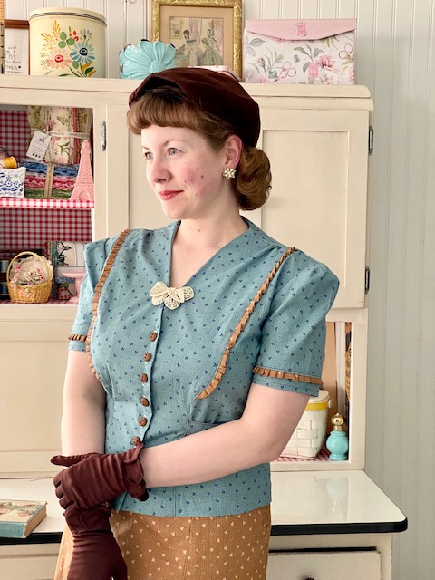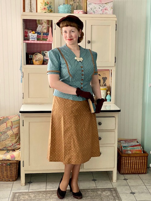 I paired it with my often-worn favorite 1940s vintage brown heels and hat. The gloves and bow pin are also most likely from the same decade.
