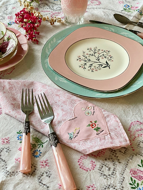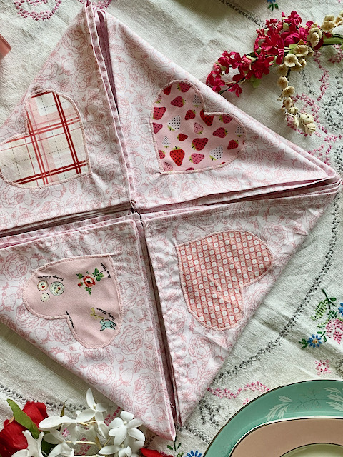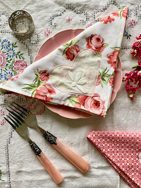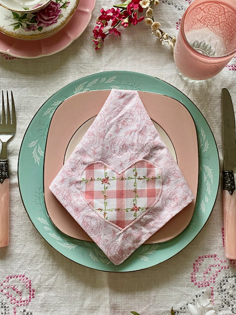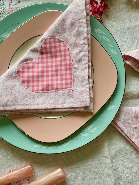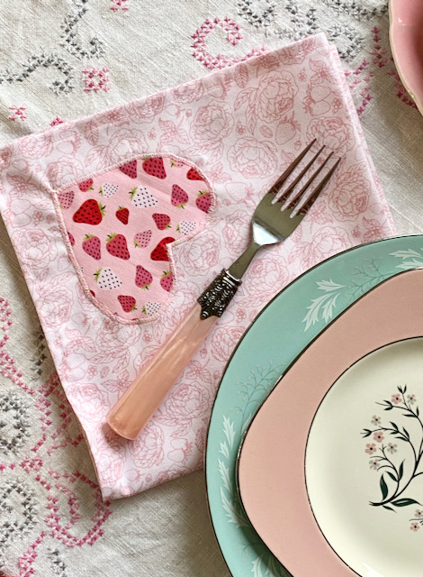 The fun thing about using different fabrics for each heart means that depending on how I fold the napkin, I can have 2 different looks. This pink gingham and the strawberries are on the same napkin.