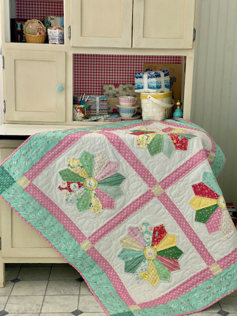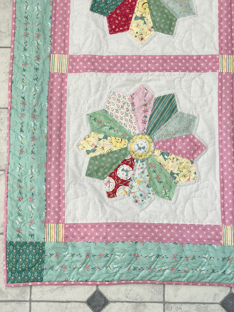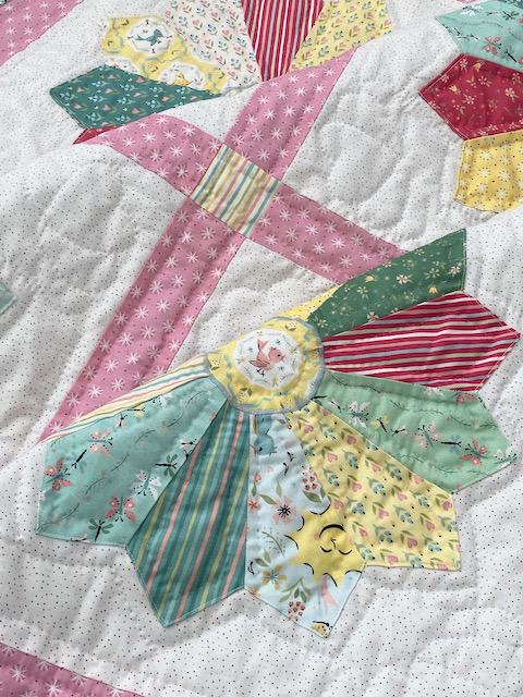 Making only 4 large Dresdens meant they worked up very fast, and then I just top stitched around the edge onto a 17" square of fabric. After that it was easy to add basic sashing and borders, so it was a very quick quilt top.