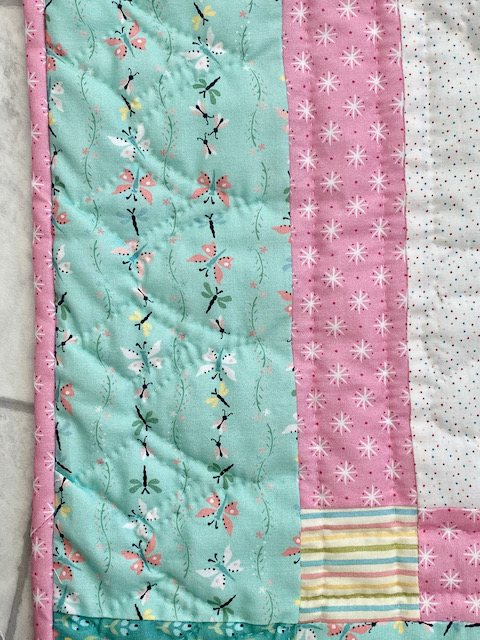I debated doing a scrappy binding, but ended up deciding to save my fabric for something more fun and use more of the pink star. But I think it would have been cute with a scrappy binding too!
