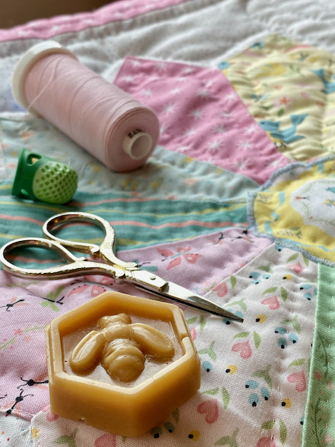 These are the quilting tools I used. The thimble is by Dritz, and my favorite of the quilting thimbles I've tried – it's cool, comfy, doesn't slip, and absolutely SAVES my fingertips! And after some frustration with my thread knotting mid-stitch, I remembered my trusty beeswax, which helps tremendously with minimizing thread tangles.