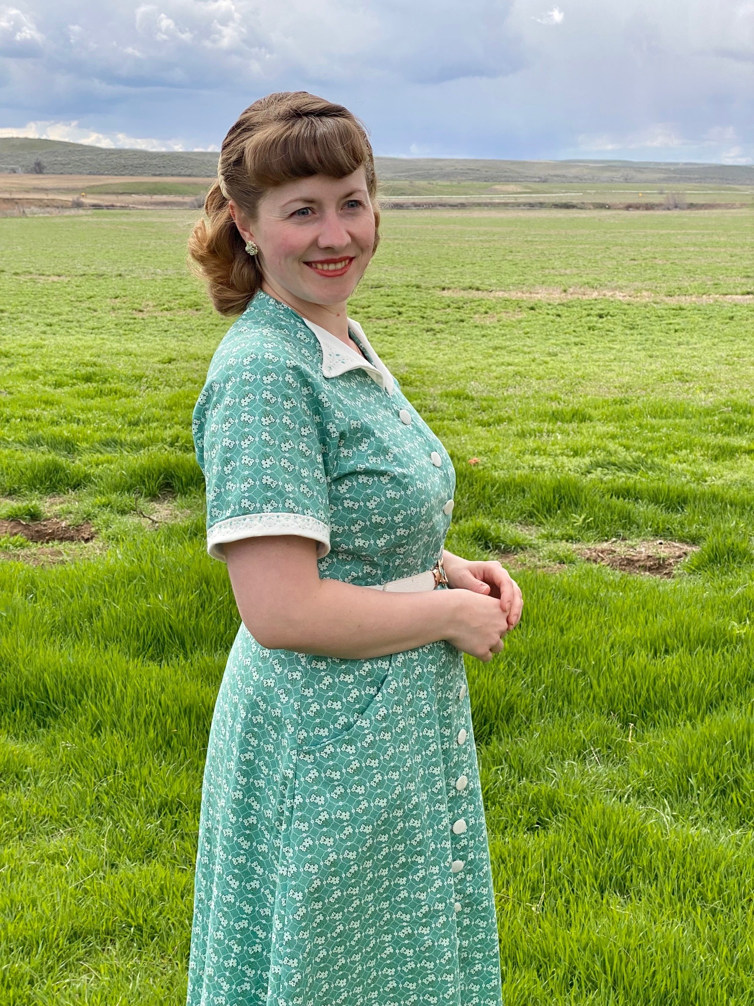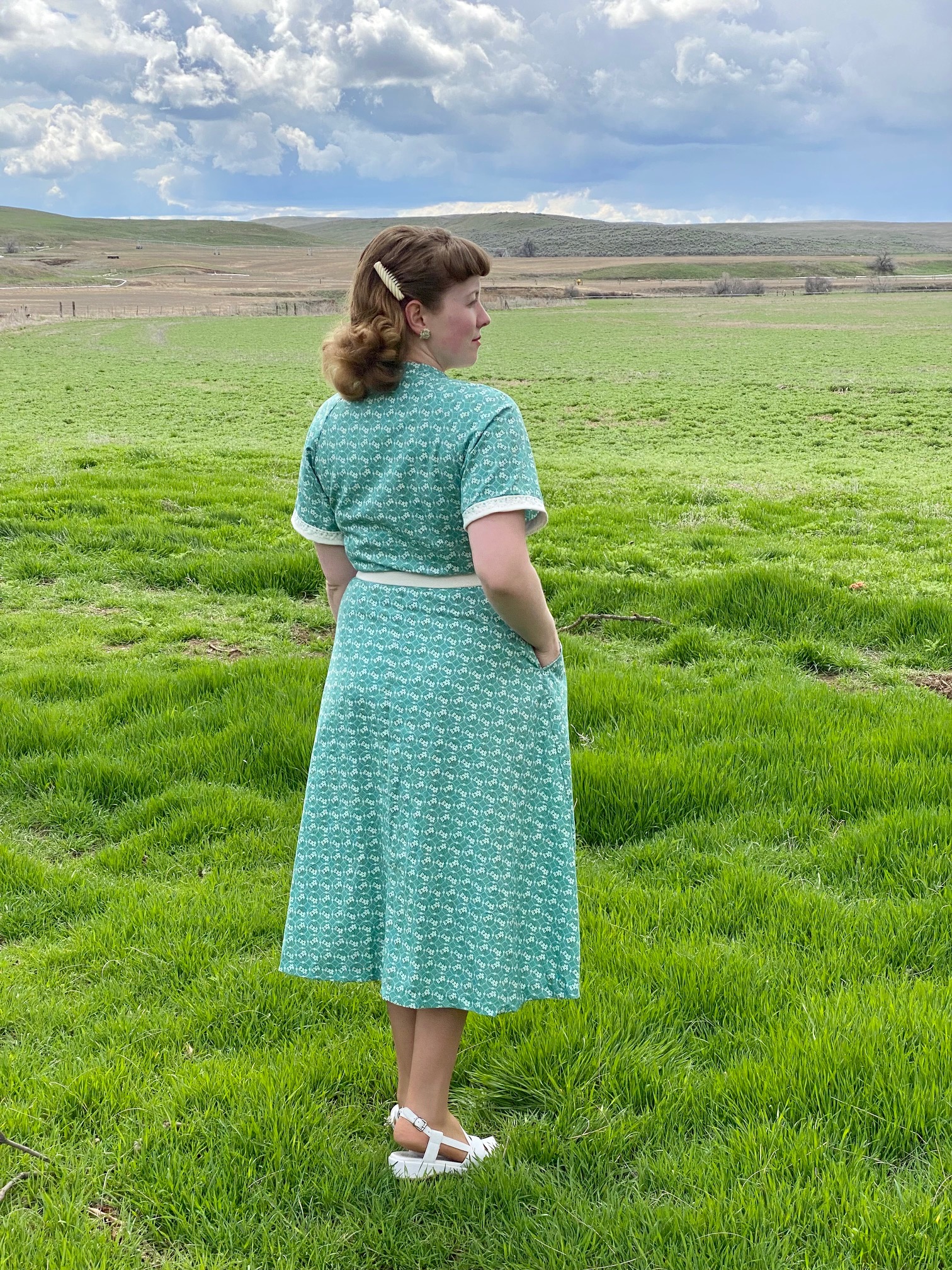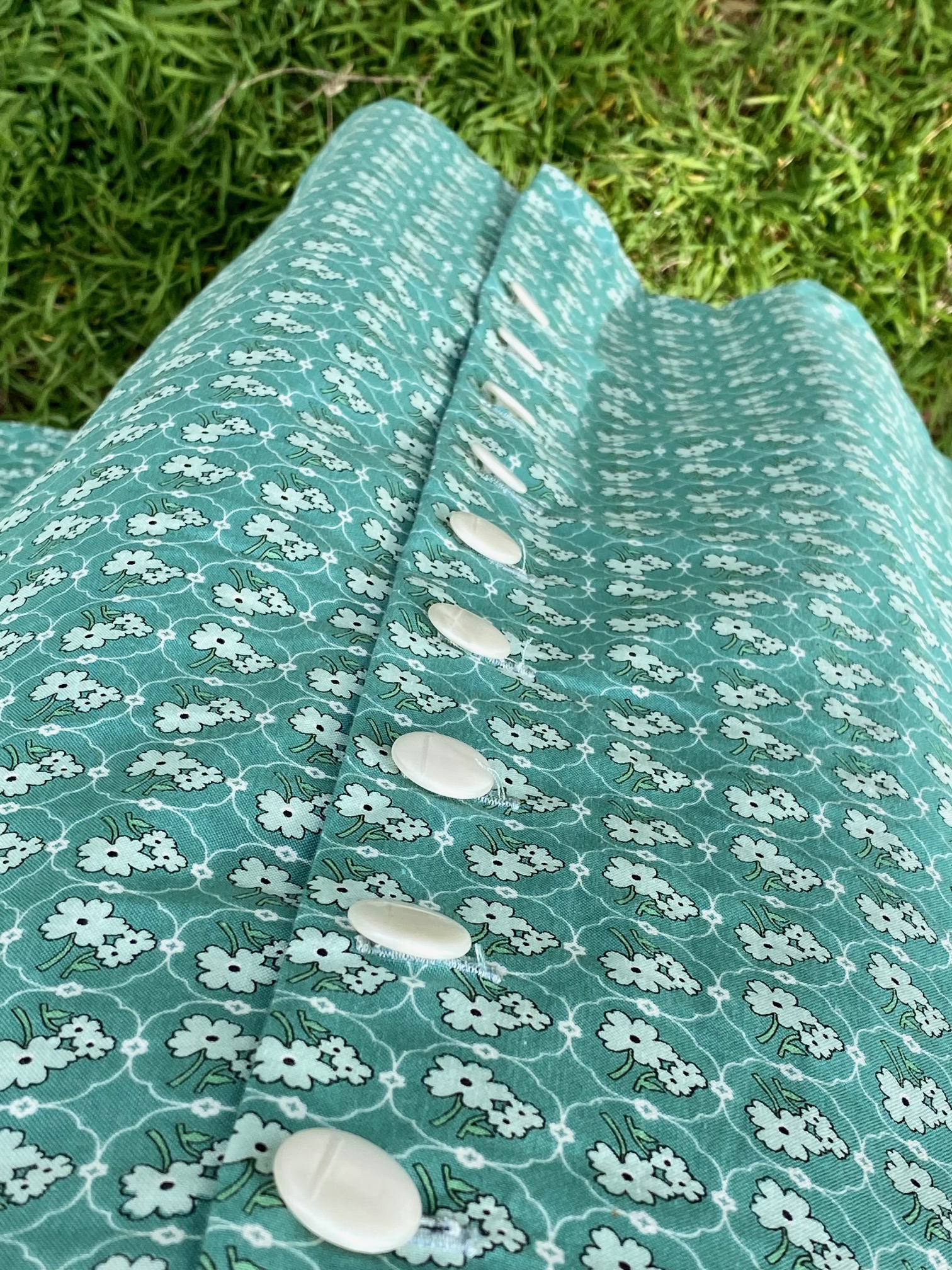 I used a dreamy teal floral repro quilting cotton from The Timely Tailor, and this vintage pattern I got from the UK years ago. Turns out it had extremely little instructions and no diagrams, so I was basically on my own. Thankfully I'd made some dresses in a similar style before.