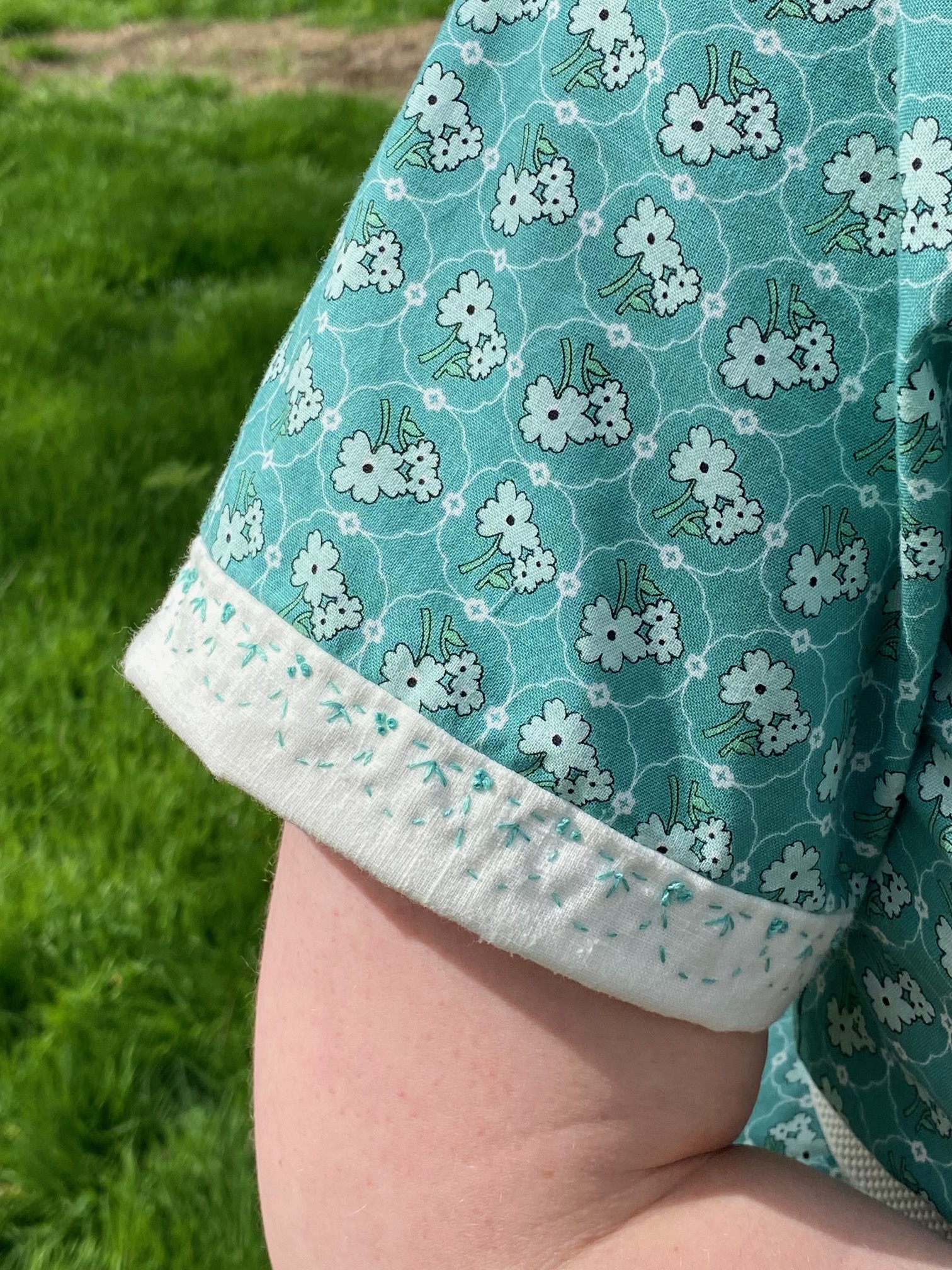 I used an off-white contrast for the collar and cuffs, and decided to add a little embroidery just for fun. it makes a nice finishing touch, but it definitely added some time to an otherwise quick project.
