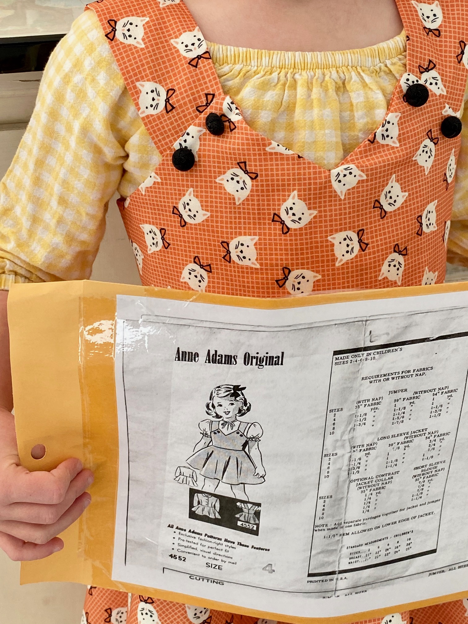 It was hard to choose which pattern to pair with it and I debated over 3 different ones…but I finally settled on this adorable jumper dress that I'd copied from my sister-in-law years ago.