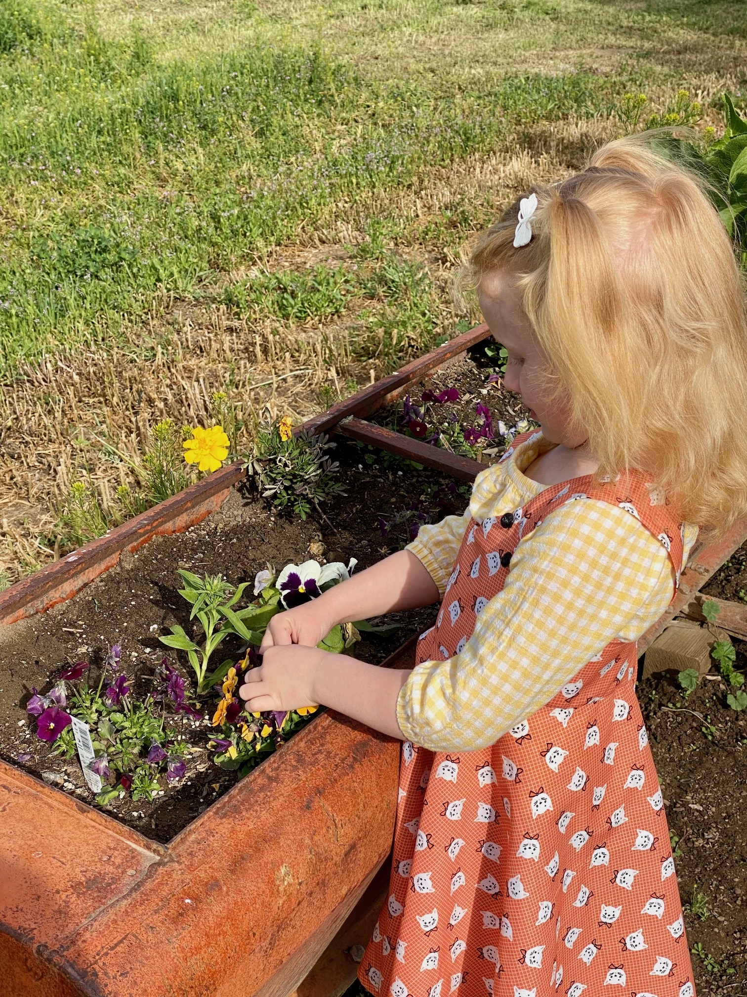 I lengthened the skirt as much as I could fit on the width of my fabric, and it still ends up just below the knee – but for an everyday dress for an active girl, that works fine!