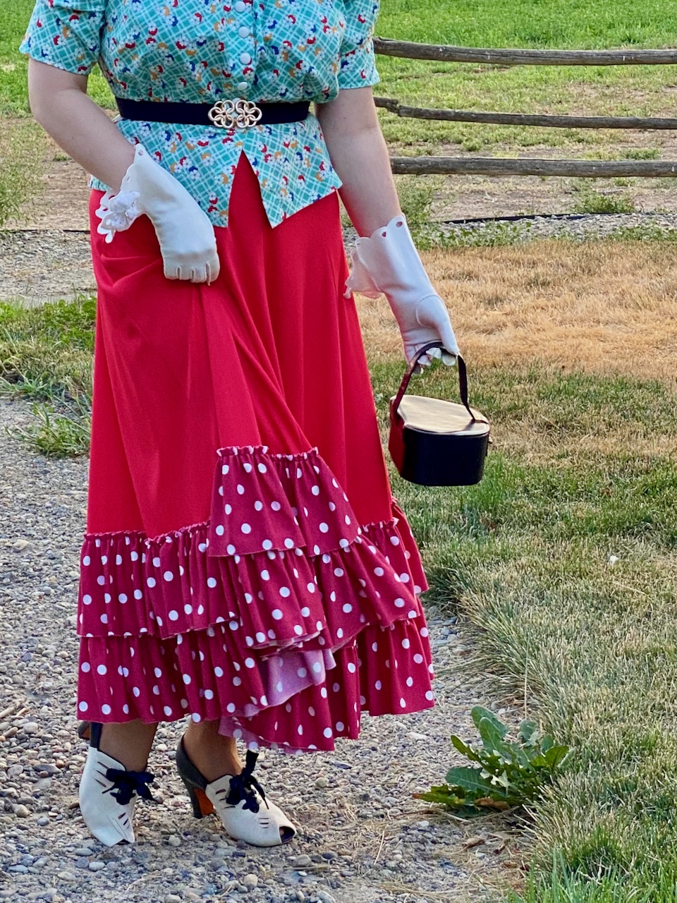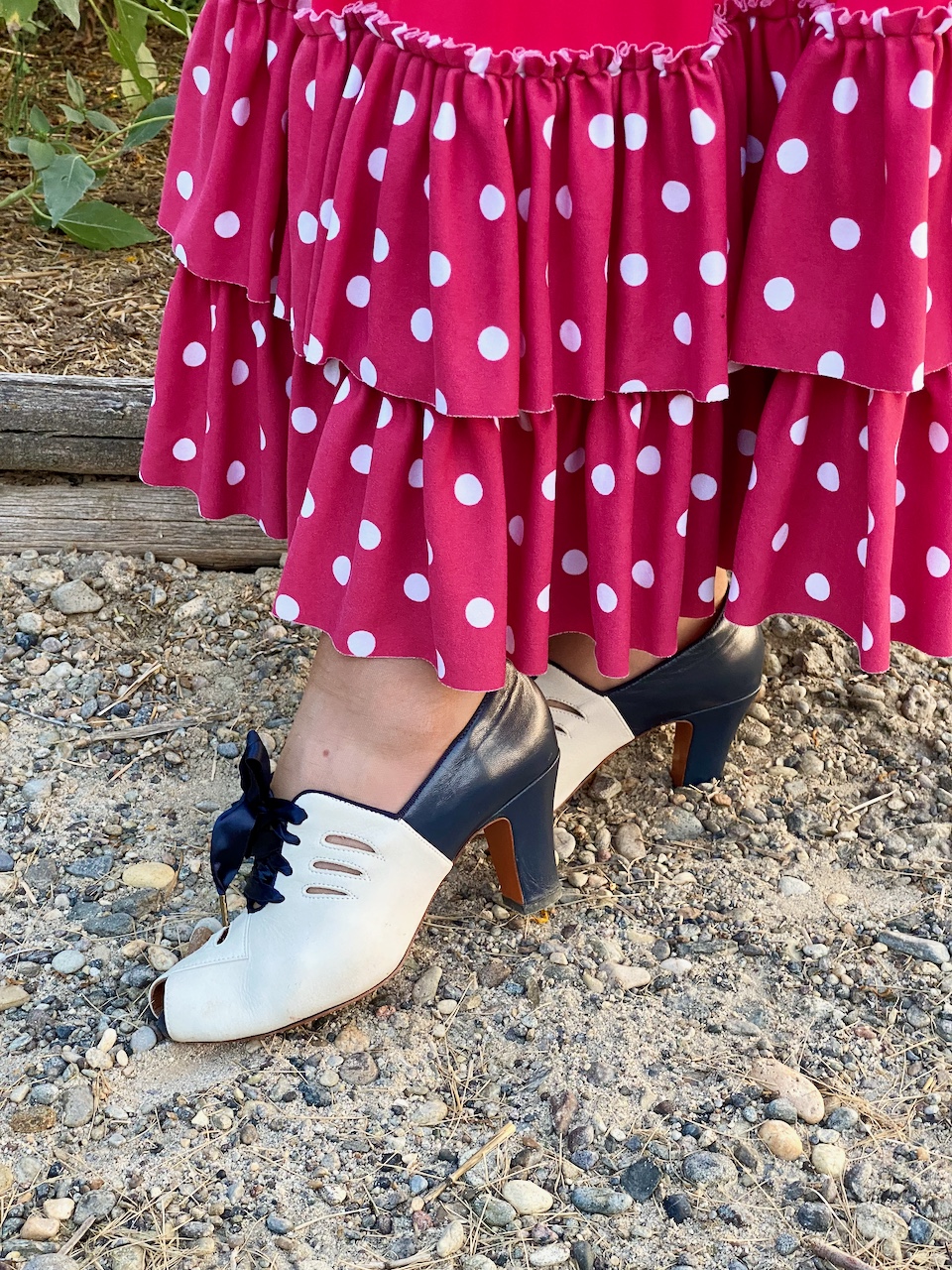 The purse is actually 1950s, but it was cute and navy and I wanted an excuse to carry it, so here it is! Also this was a perfect time to wear my most flamboyant art deco gauntlets and favorite 1930s repro shoes from Remix.
