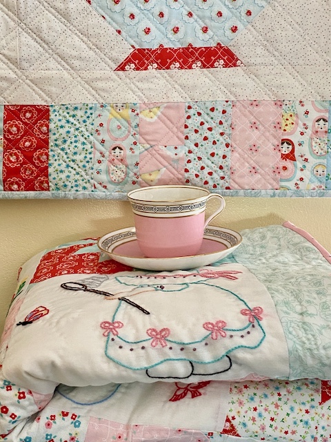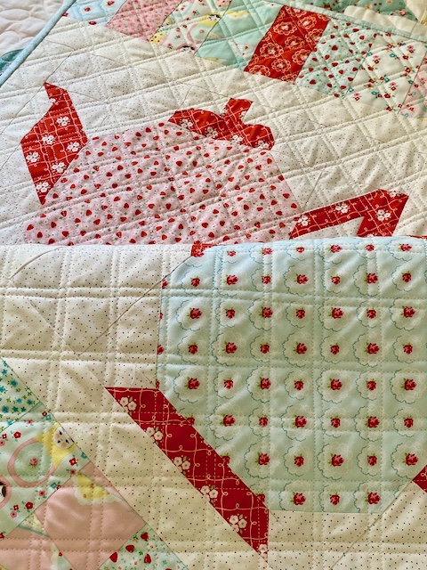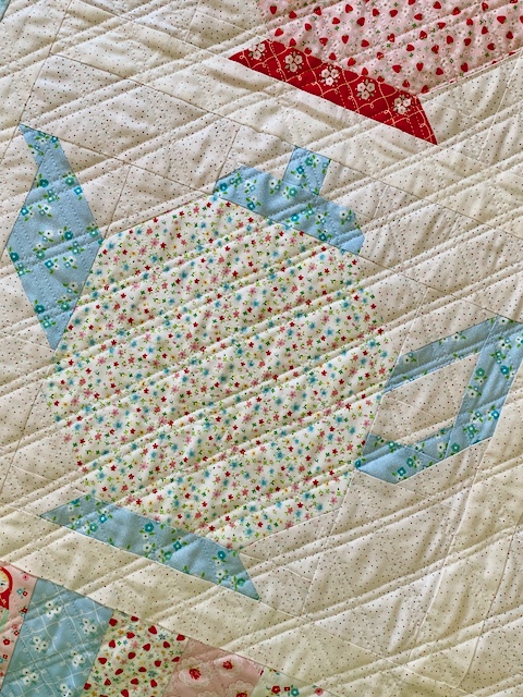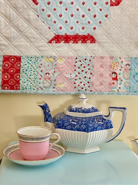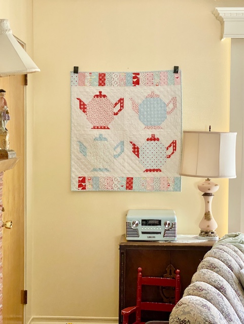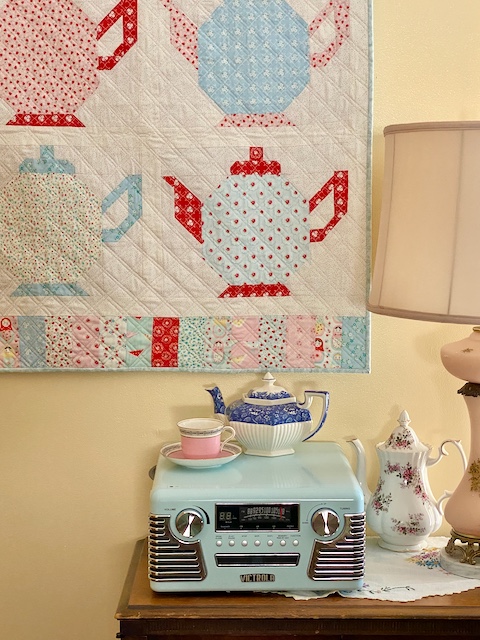 For this one I used Lori Holt's Granny's Teapot pattern, making 4 teapot blocks, and adding my own border to make the size a good one for my space (and to add in more of the cute prints).