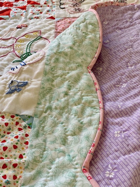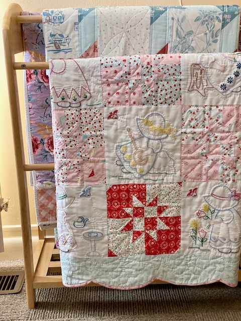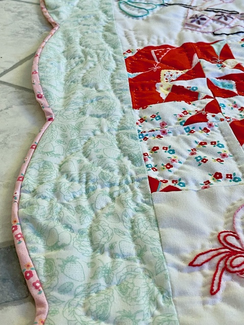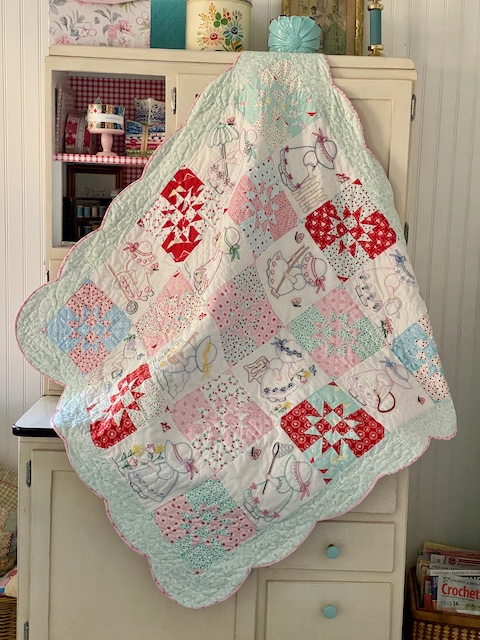 The scallops finish the edge perfectly, making it such a fun little girly quilt! I had to hang it up in my living room so I can enjoy it for a while.