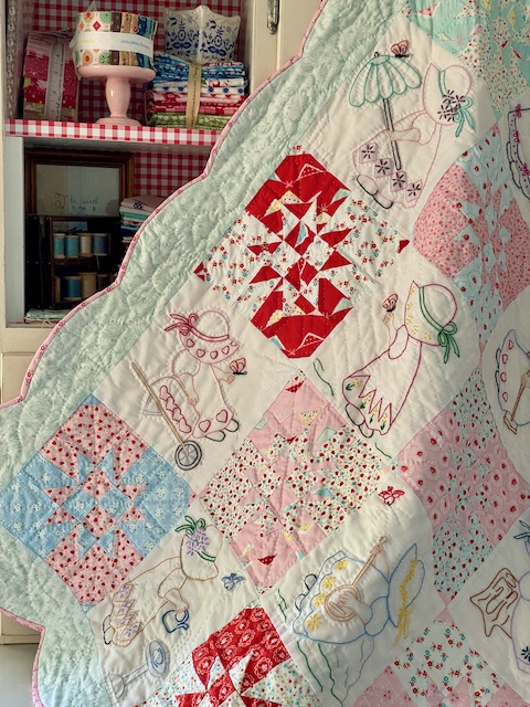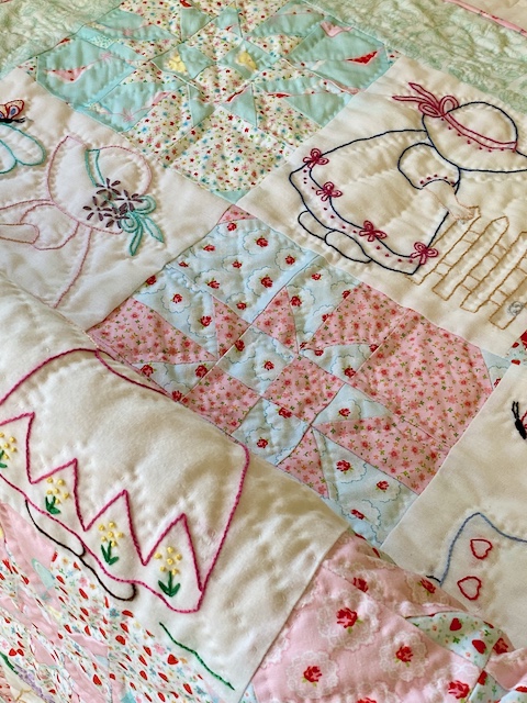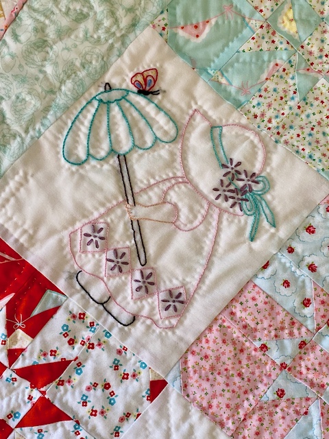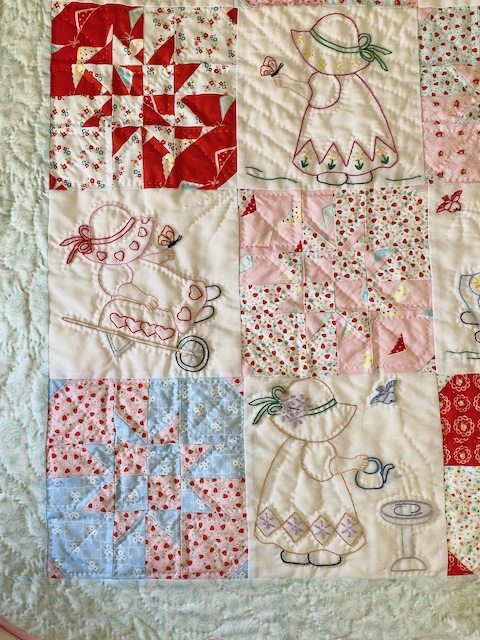 I couldn't stop with one quilt, so I made two! First I noticed that the fabric was a good match to the colors I had used to embroider these Sunbonnet Sue blocks I started as a teen and finished up the first year I was married (before I had taken up quilting, so I just stored them until later).