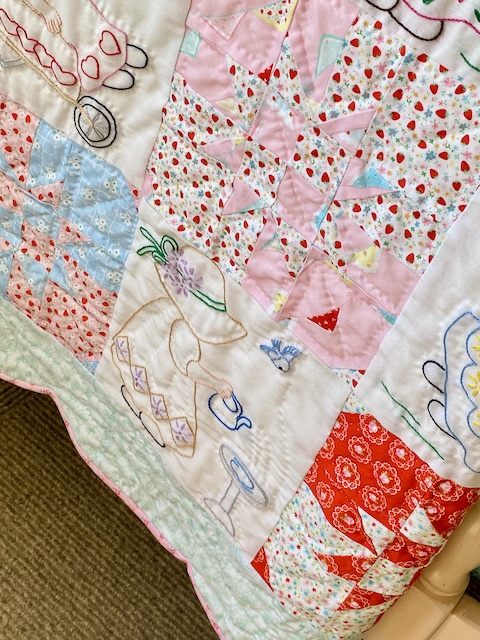 I custom quilted around each of the Sue blocks (the one with the parasol is my 2-year-old's favorite!), adding fun little details in some of them, and did all the star blocks alike. It was quite a bit of hand quilting in a short time, so now I'm ready to take a break before I start the next project!