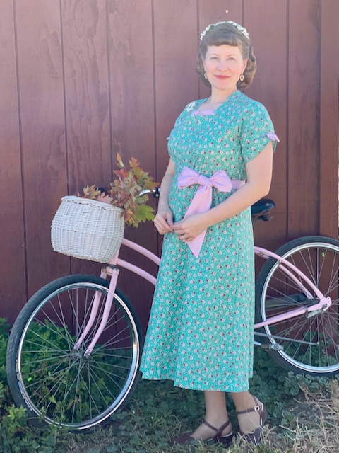 This one I've made before once, and it's not really maternity. It's fitted on one side, with a looser side that is gathered by the sash. It's already about maxed out, as you can see in these photos, since the center seam is already distorted. But it sure will be a comfy postpartum dress!