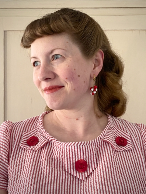 I really like how the neckline turned out – though it was an accident! I didn't want to fuss with a collar, so I was just going to bind the top as an easier alternative than facing, but when I pulled out the card of red buttons for a photo prop below, I realized how well they went with the fabric so I tried to come up with a way to incorporate them. Tab trim was the answer, and I like the detail it adds.