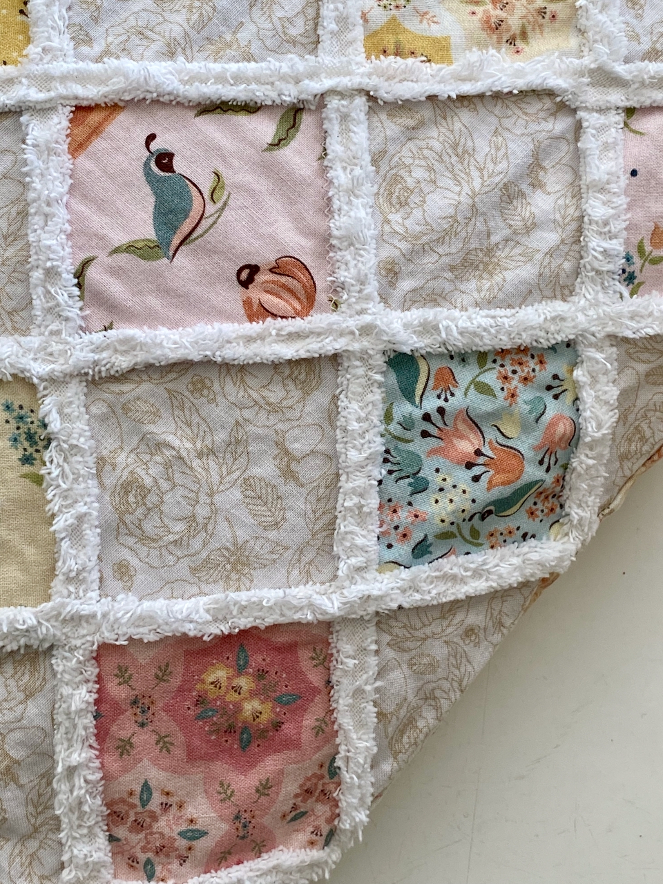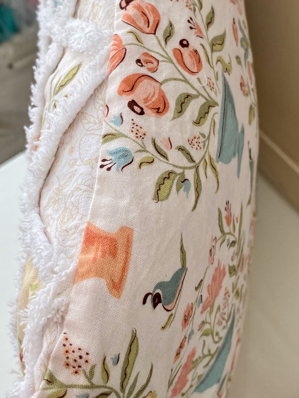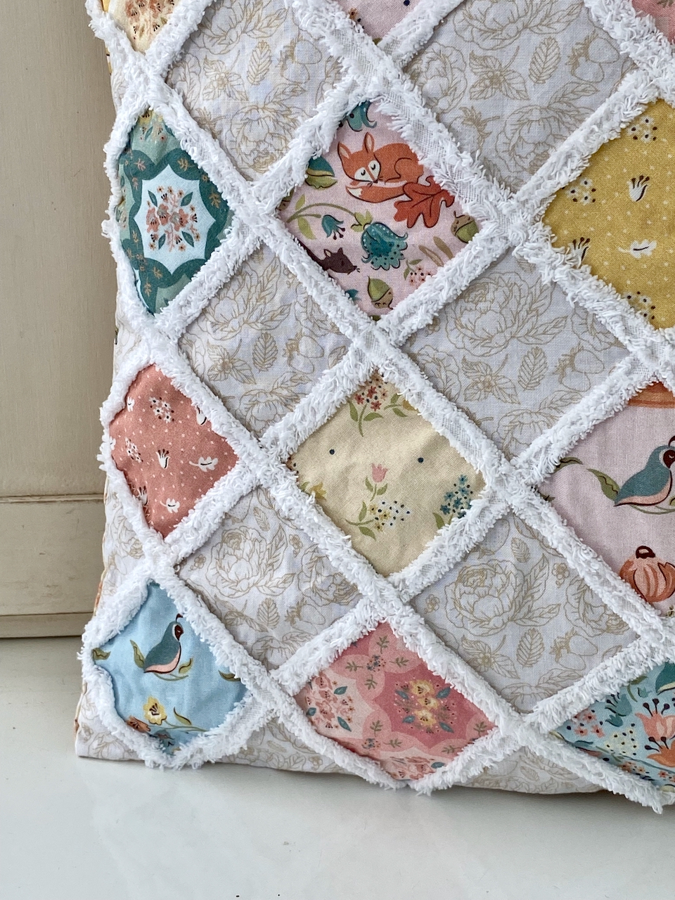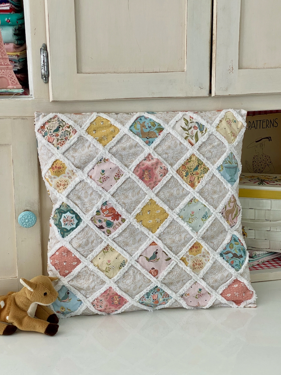 Then I used a larger variety of prints from my fat quarters to make a pillow cover. I saw one made from this pattern on Instagram, and knew instantly what I wanted to do with the roll of Chenille-It I had in my drawer.
