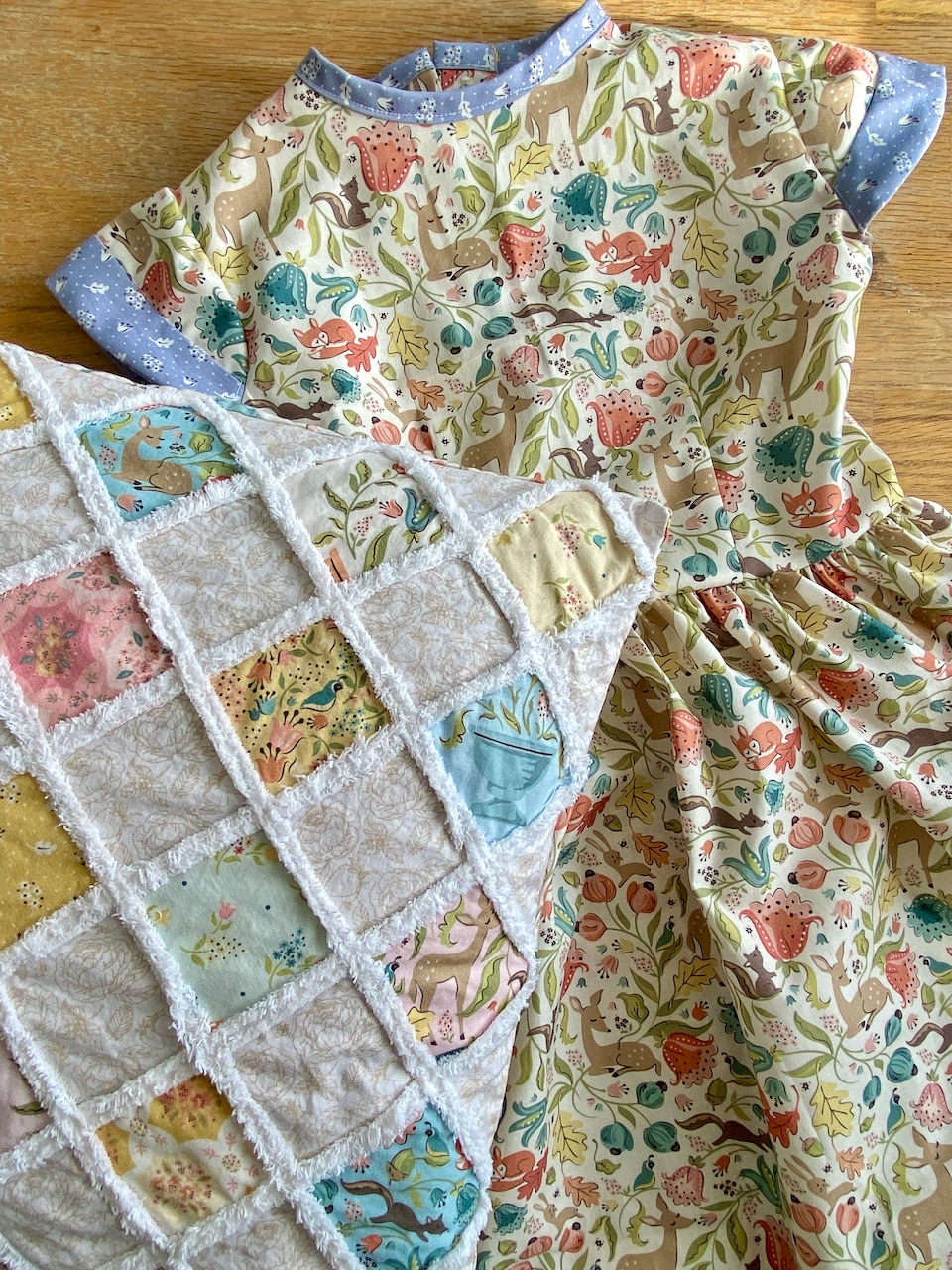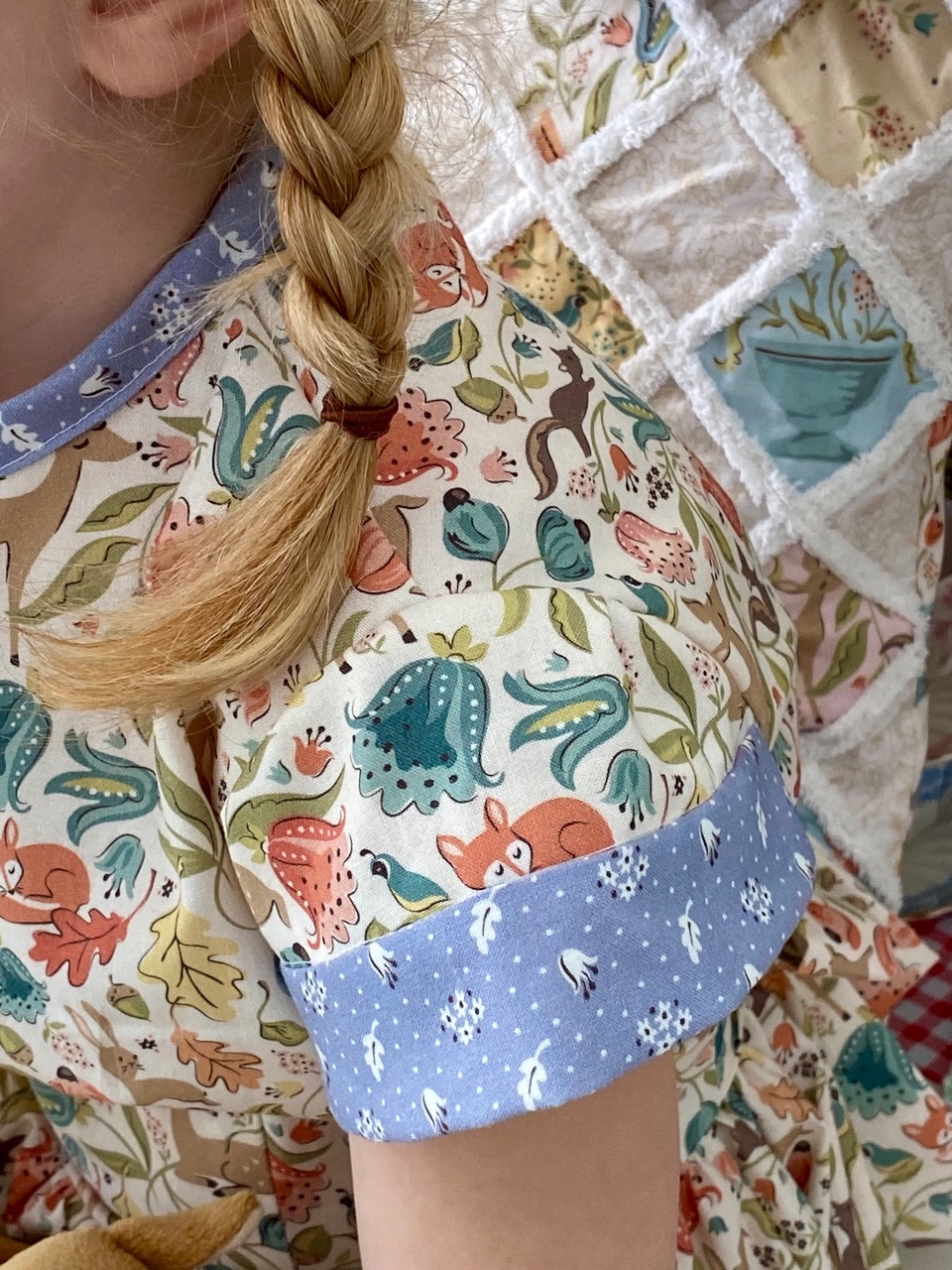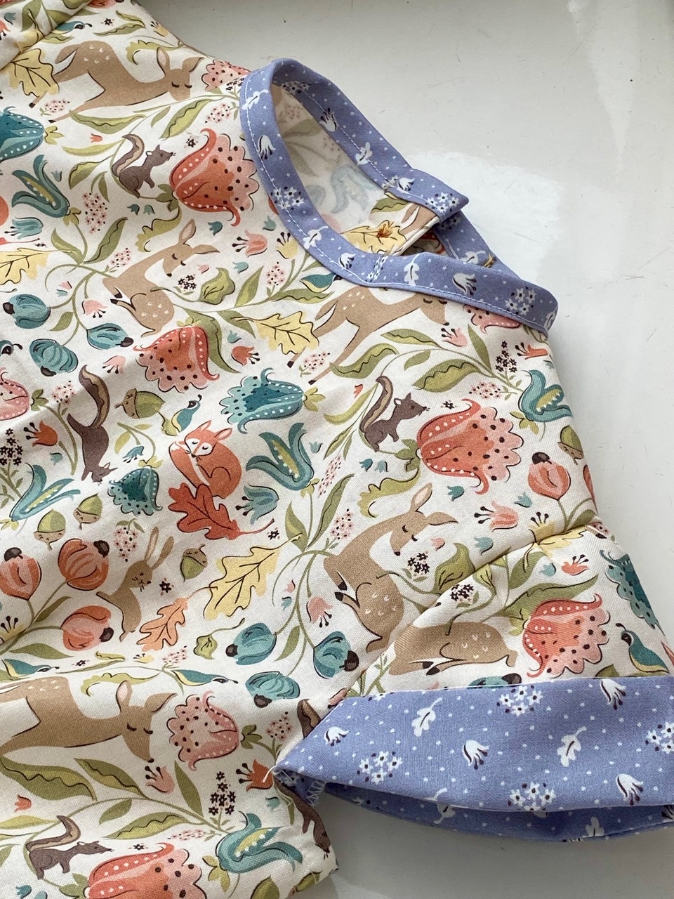 I used one of the cute woodland animal prints, and accented it with the blue print. It was a pretty basic pattern, with the cap sleeves as a unique feature.