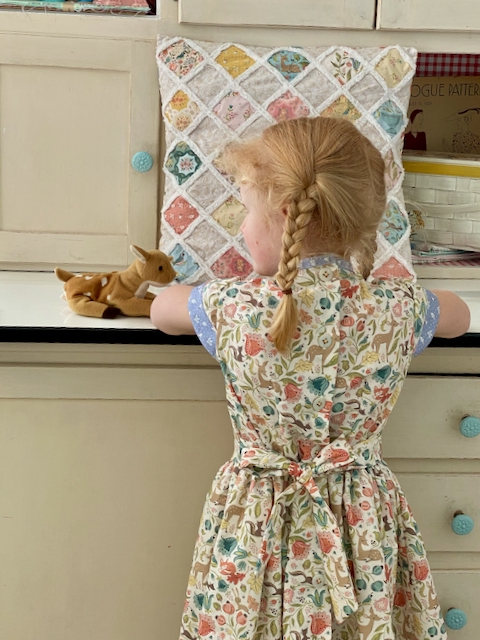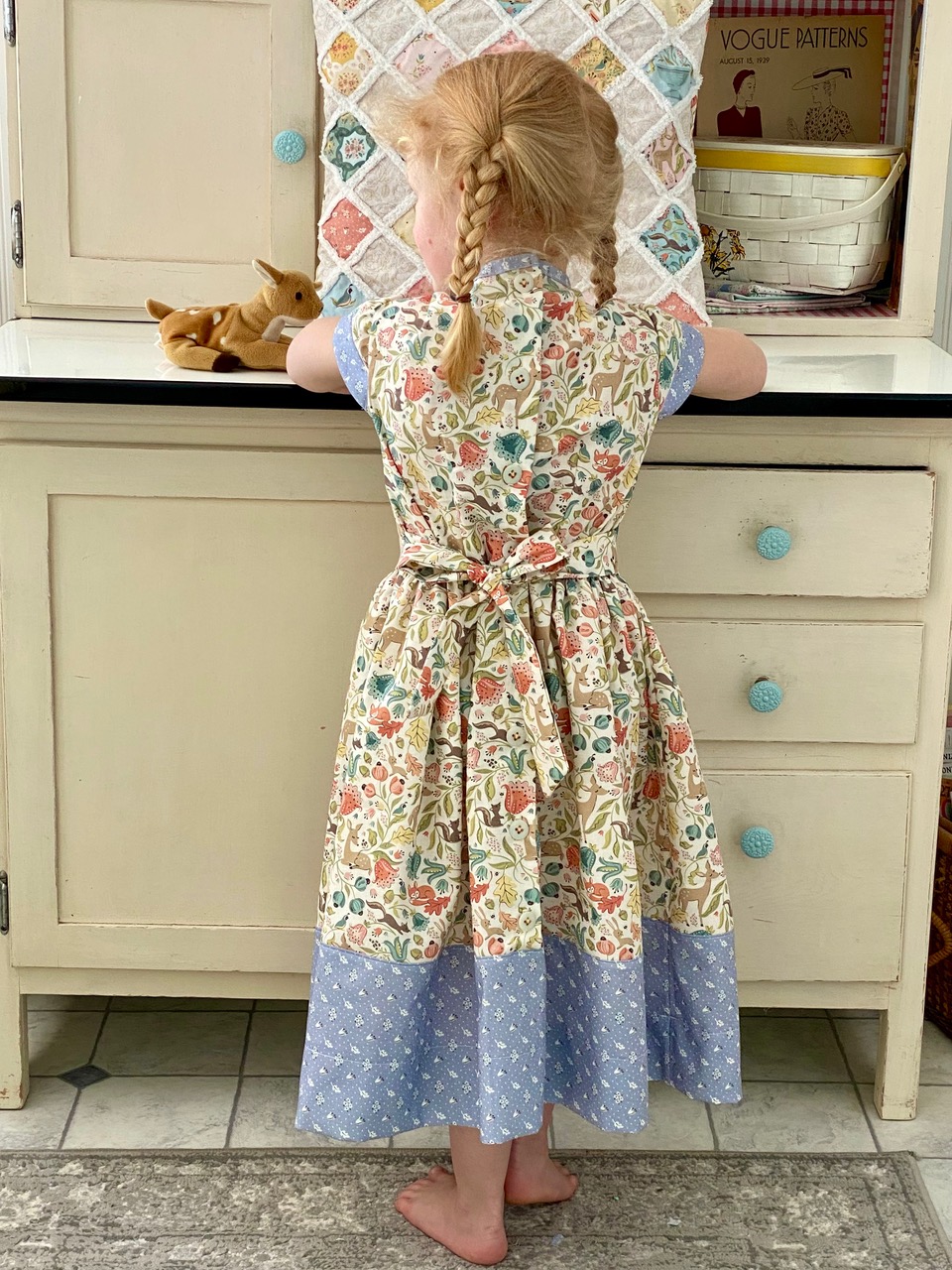 I made two projects with my fabric selections. First, a 1950s dress for my little girl. She is growing out of everything, so I made it extra long so it will fit her for a while, and altered it to open down the back as far as the contrast band at the bottom.