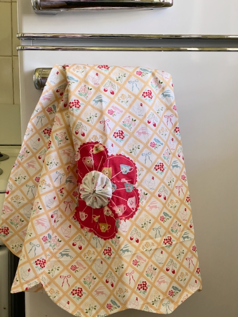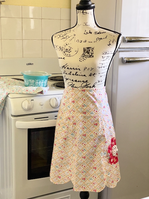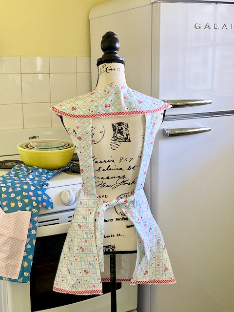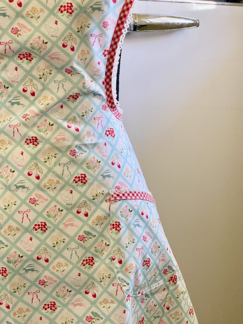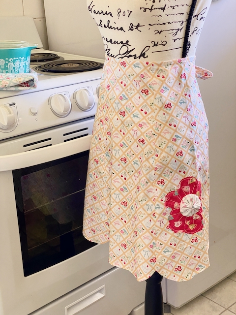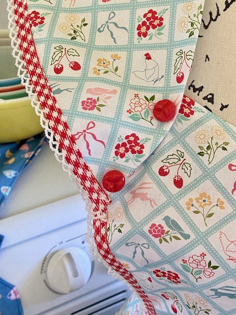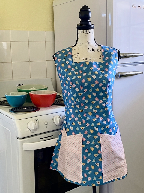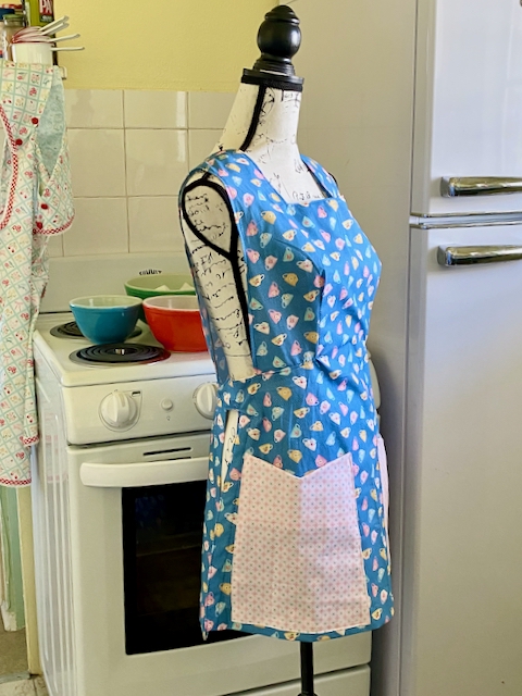 Apron number 3 was a cobbler apron style, also from the 1950s. I used to not like this kind of apron, as it doesn't reach down far enough for me to wipe my hands on when baking – my main use. However, it dawned on me that this is more of a work apron type than a baking apron, and it sure would be handy to have those big pockets while cleaning up and tidying.
