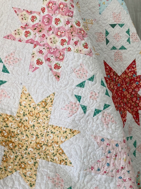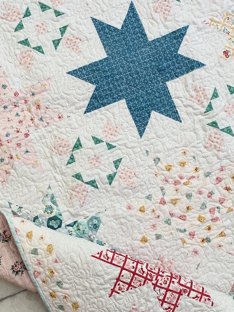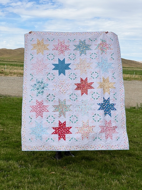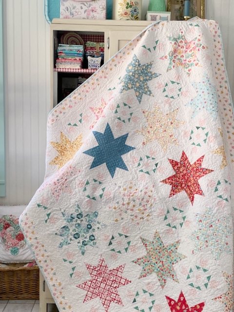 It was perfect for this fabric line, since the stars show the pretty prints so well. Of course my other favorite teacup print became the border, so I can enjoy it more.
