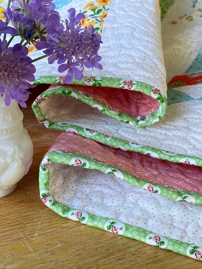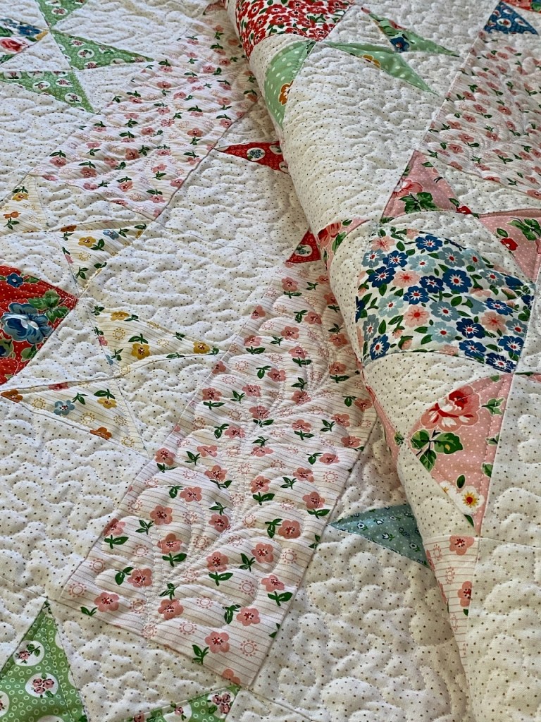 My favorite quilting detail is the freehand feathers alternating directions in the pink bars.