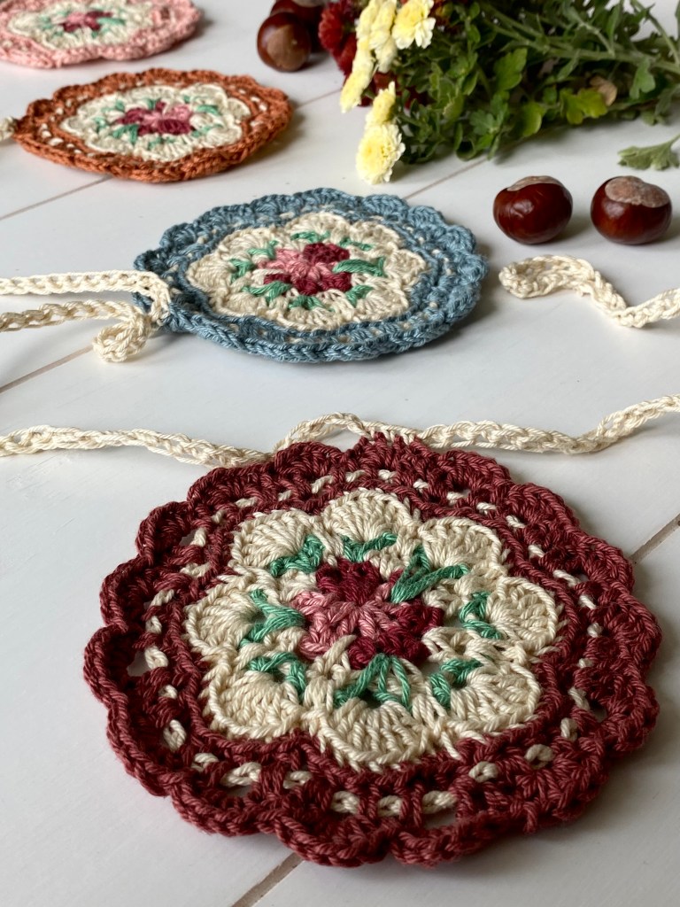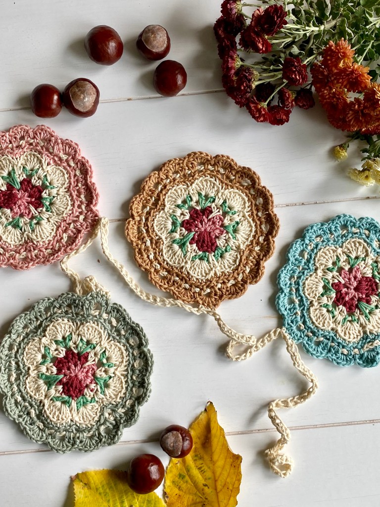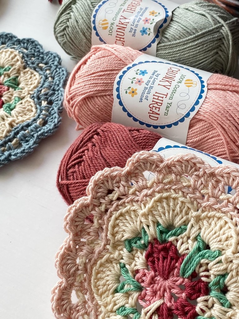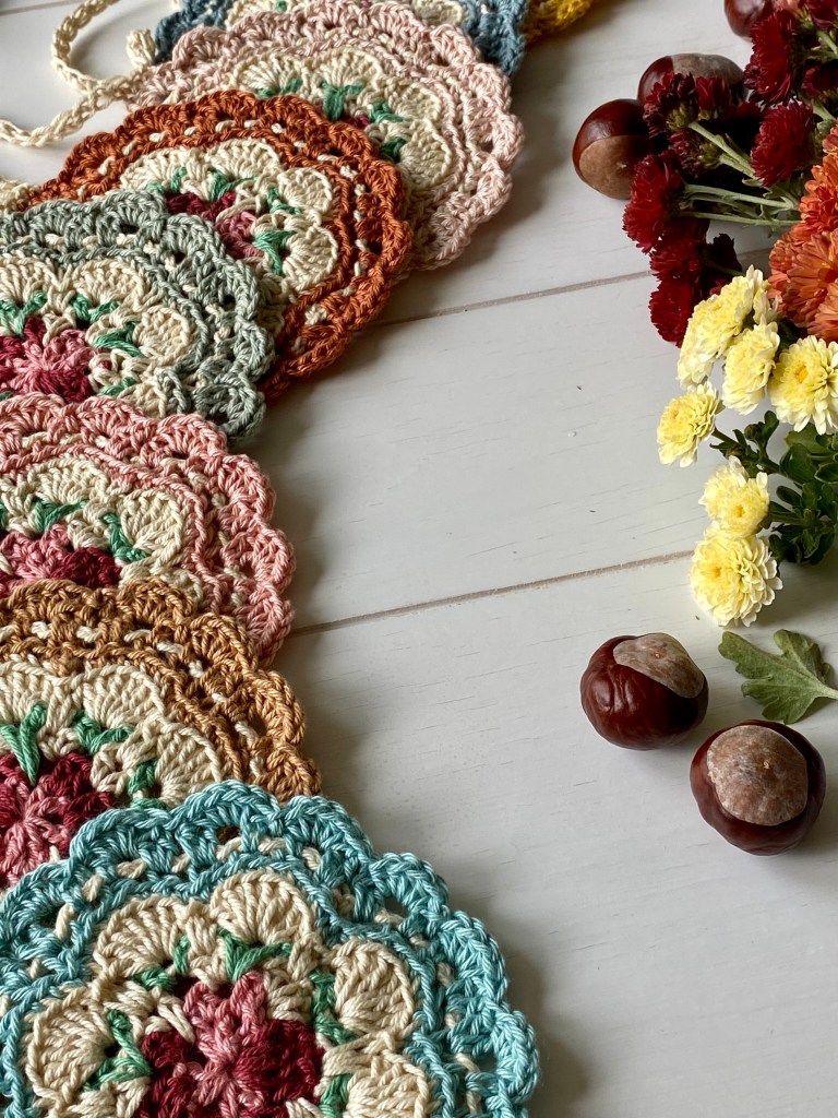I used Chunky Thread (sport weight cotton) in some dreamy fall colors to make this version. The flower centers are all the same. They use Blossom and Brick, with Leaf as the green (though to be honest I wished for a more fallish green and would probably recommend Tarragon or Sage instead), and Chamomile for a lovely antique background.
