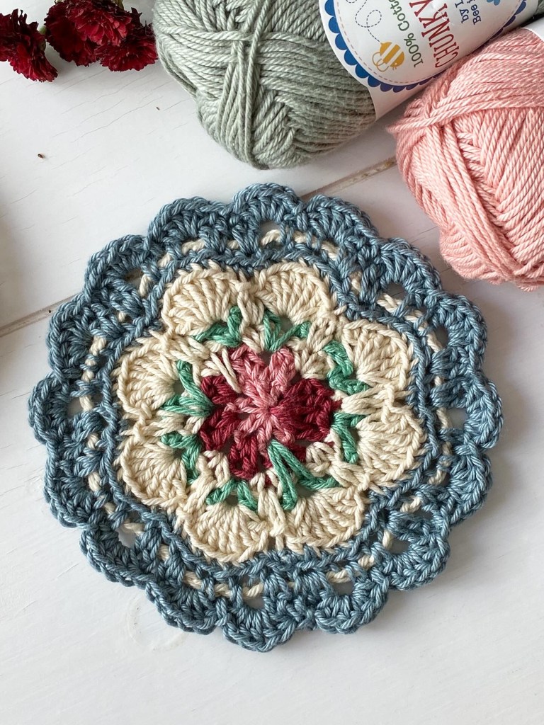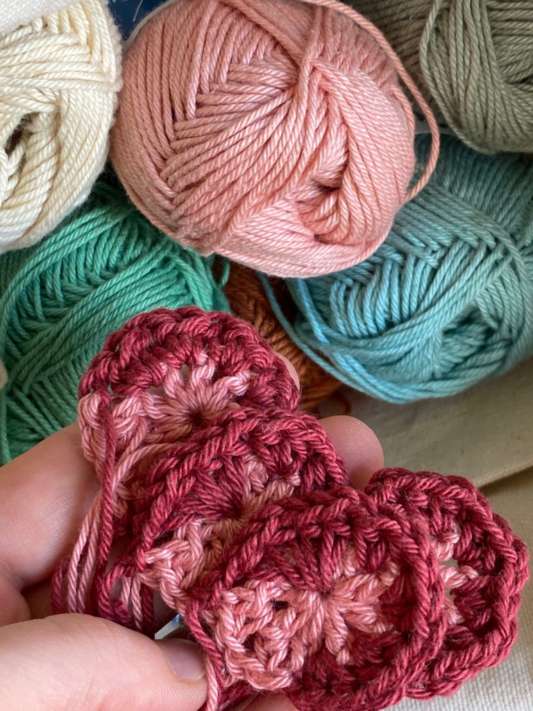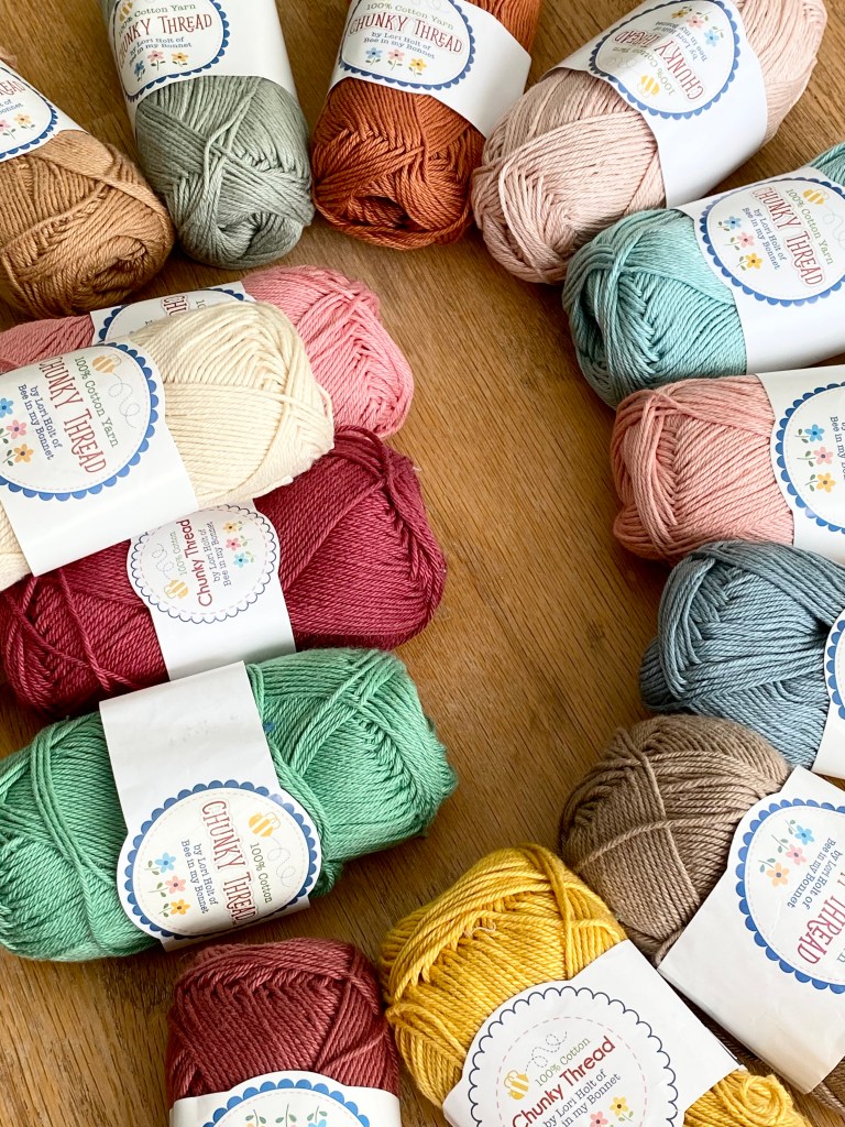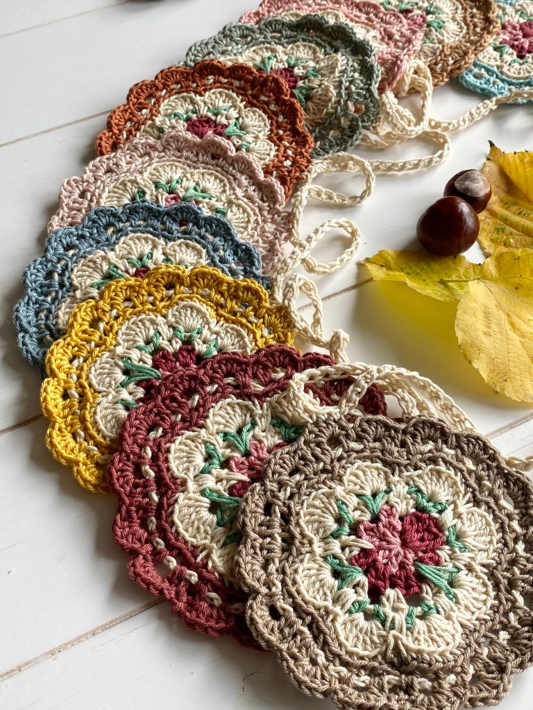 I used Chunky Thread (sport weight cotton) in some dreamy fall colors to make this version. The flower centers are all the same. They use Blossom and Brick, with Leaf as the green (though to be honest I wished for a more fallish green and would probably recommend Tarragon or Sage instead), and Chamomile for a lovely antique background.