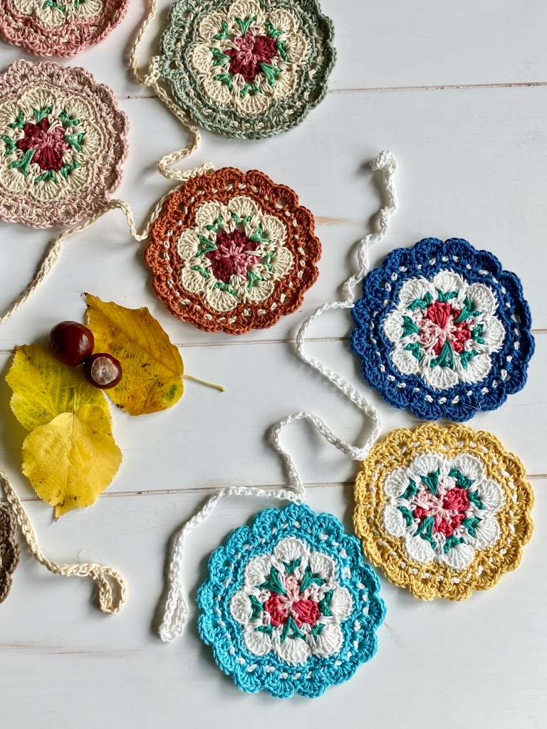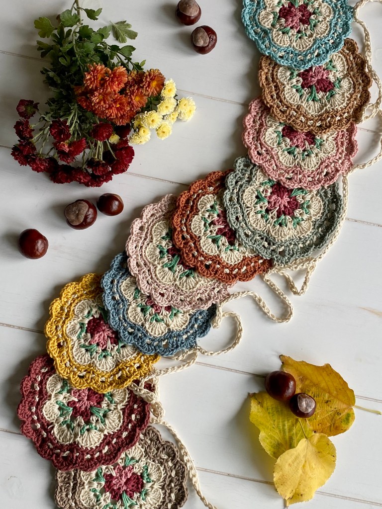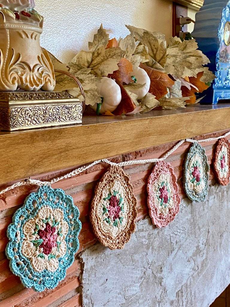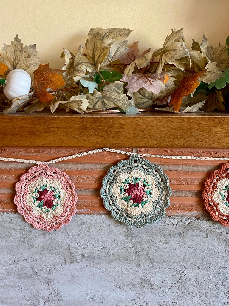 I had seen some lovely versions on Instagram of this pattern as the afghan squares it’s written for, but I was struck by one version where it was stopped partway through and finished in the round with scallops to make it a coaster. Since I don’t use coasters very much, I decided instead it would be ideal for a garland to decorate my mantel for fall.