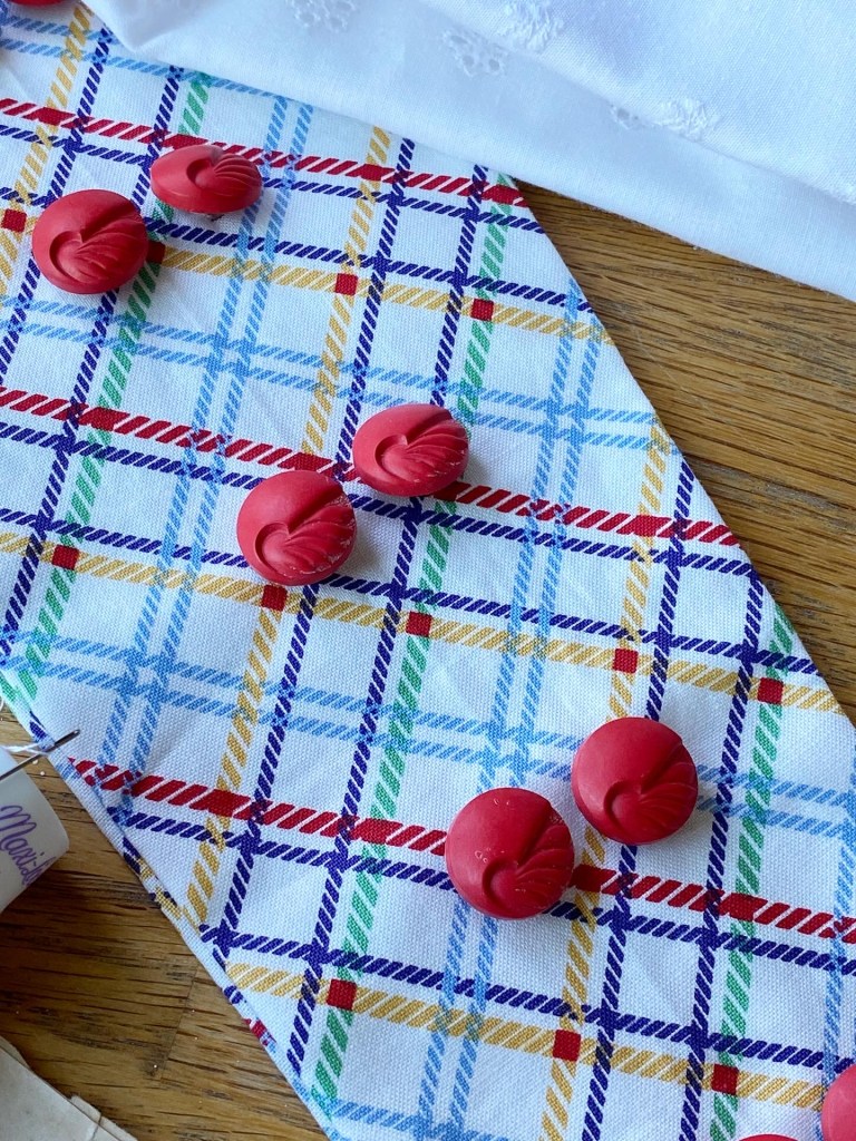It’s so colorful! It was hard to nail down what color to use to accent with buttons and belt, but I had the perfect amount of these art deco buttons in my box so I ended up choosing red. But it would have quite a different look if you went with sky blue or that golden yellow!
