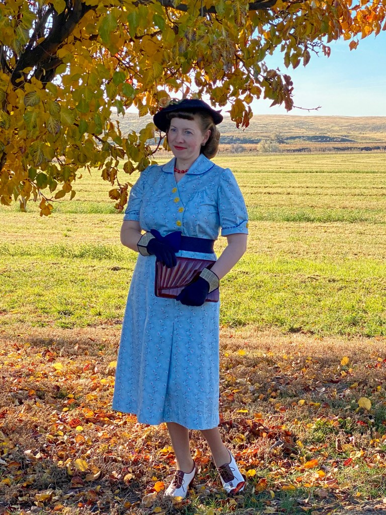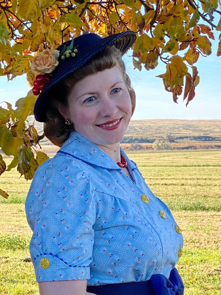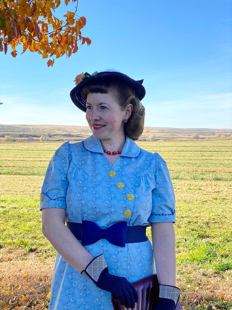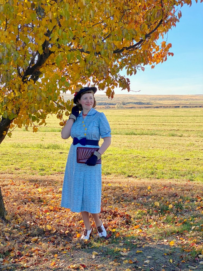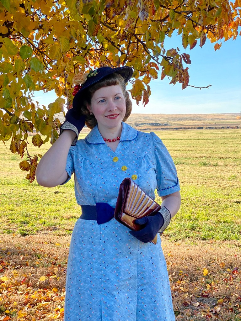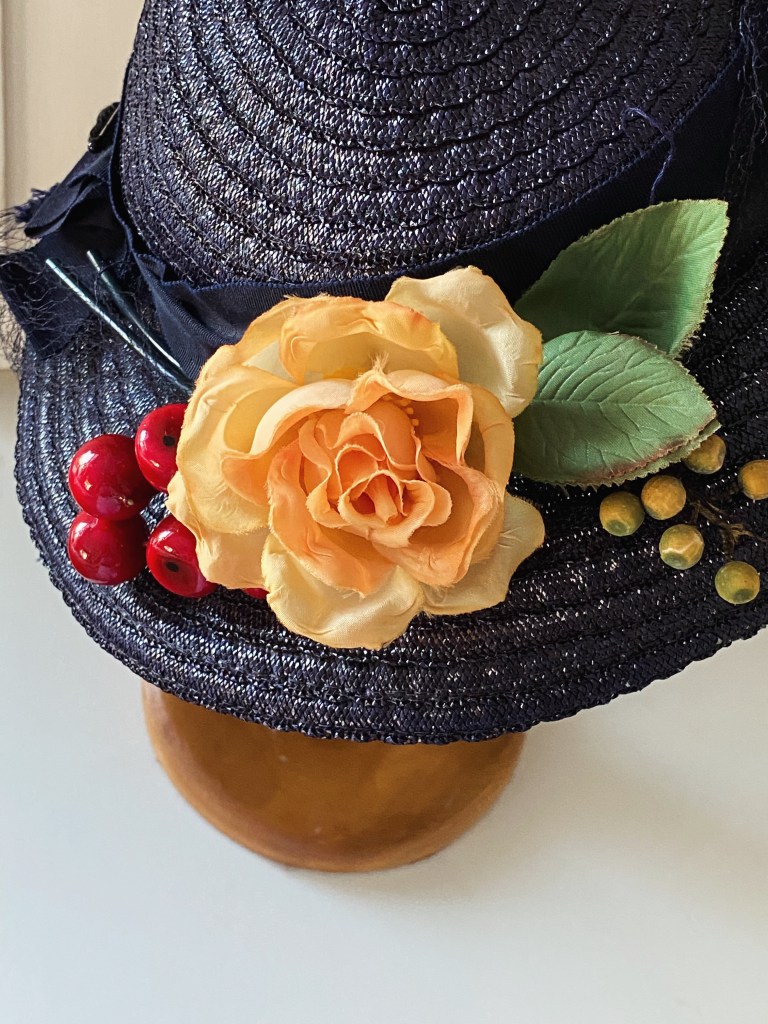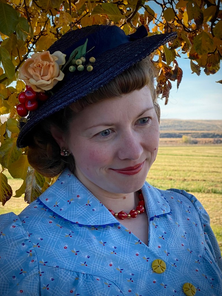I wasn’t happy with any of my hat choices, so late Saturday night I decided suddenly to re-trim one of my favorite old standby 1930s navy hats. It’s already had several iterations on this blog, and I have loved each of them. This time I tried to pull out old millinery bits that would match the dress colors, and still look pretty fallish.