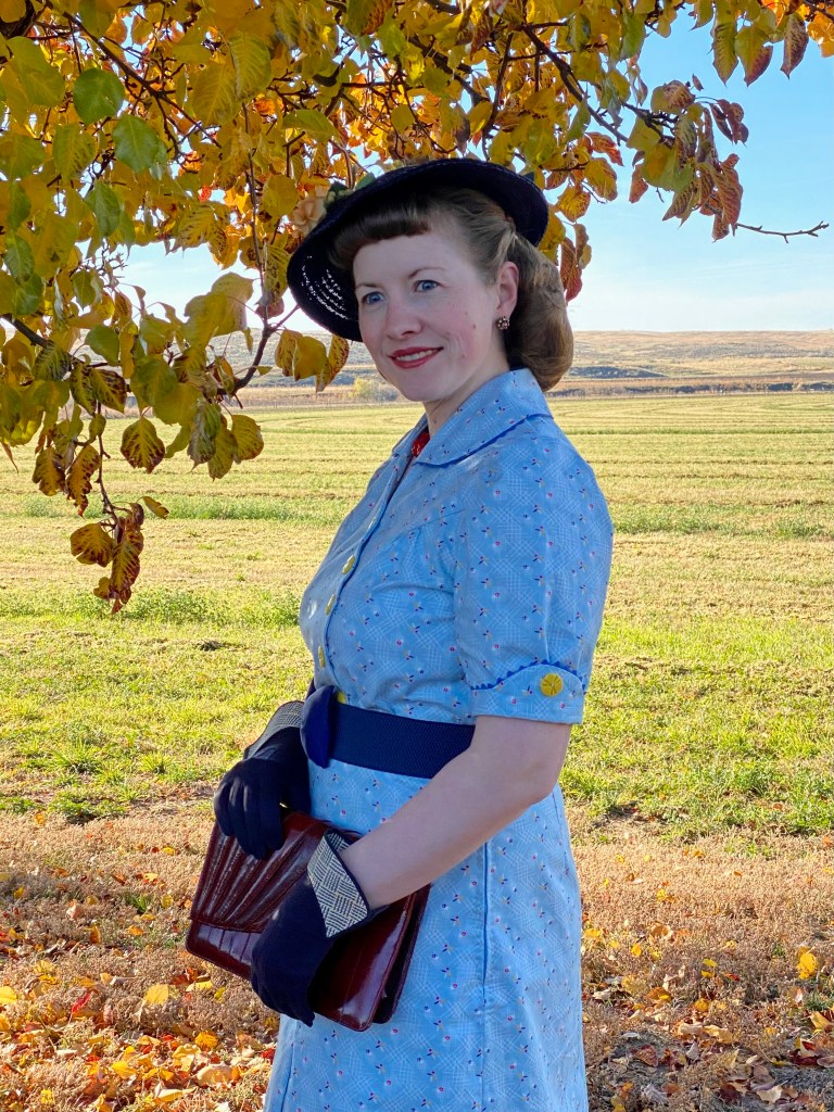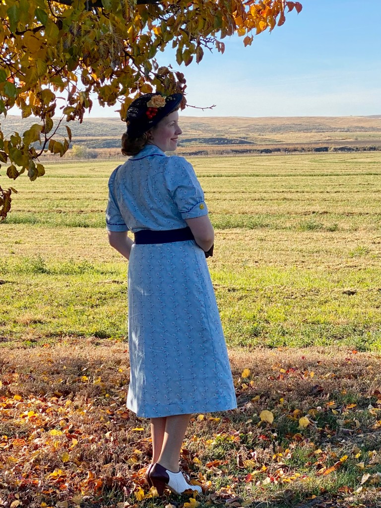 I also like the single front skirt pleats, which give a bit more walking room without hanging oddly, like box pleats do sometimes. I did have my usual 1930s challenge with this pattern, which is if I make it fit me in bust and hips, the waist is too big. This time I’m just cinching it in with the belt, but if I make this pattern again I’ll tweak it a bit when I cut it out.