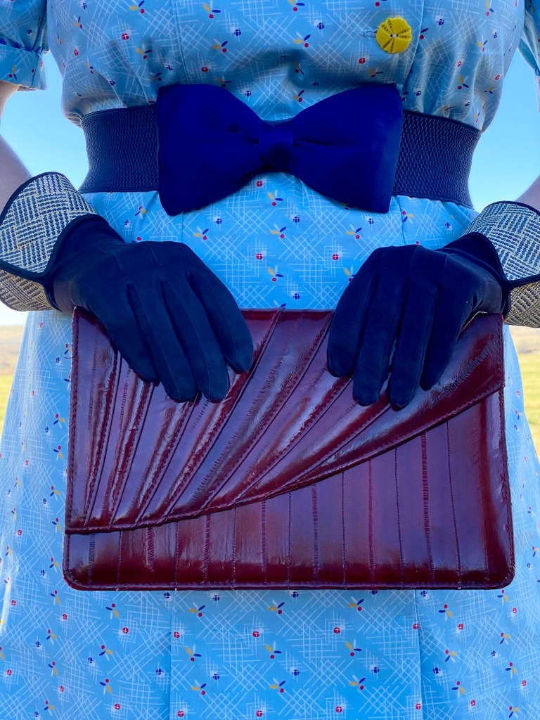Favorite straw-cuffed gauntlets (probably 1950s but a good fit for this style), chunky carved red wooden beads, and a lovely vintage burgundy lizard skin clutch were my accessories for these photos.