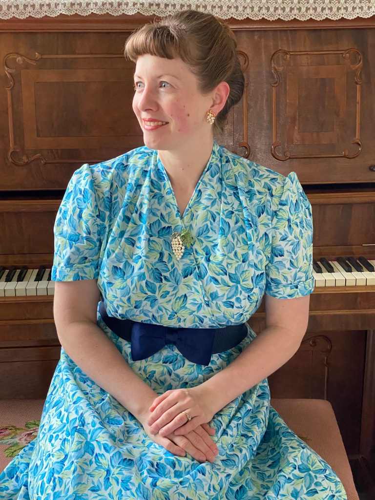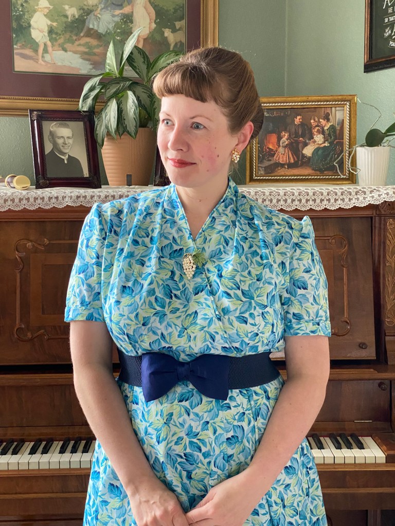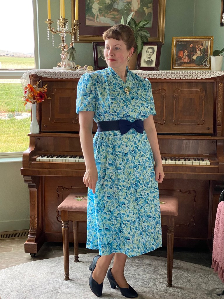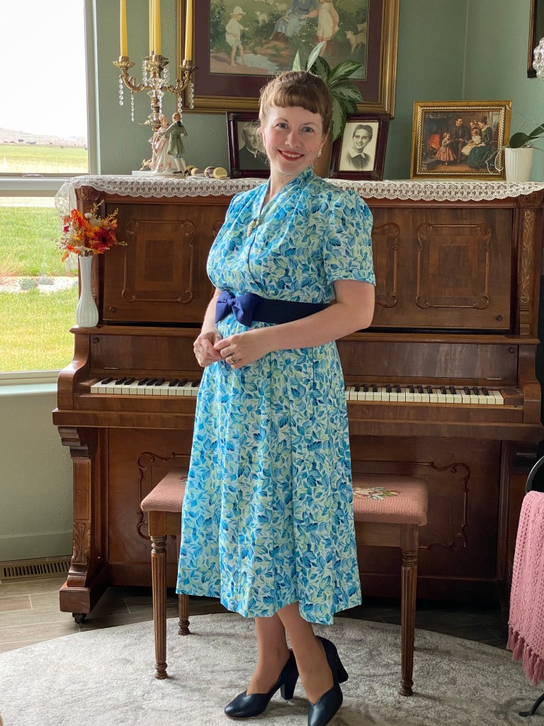 I’ve intended to make a 1950s dress with this blue leaf print for over a year, and it finally happened! This was the 2nd of the 2 fall dresses I sewed in November, and was the one I wore for our family’s Thanksgiving Day celebration this year.