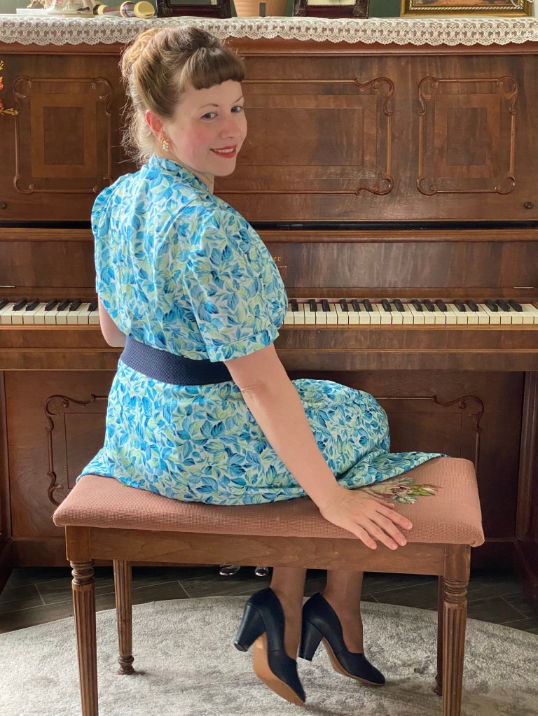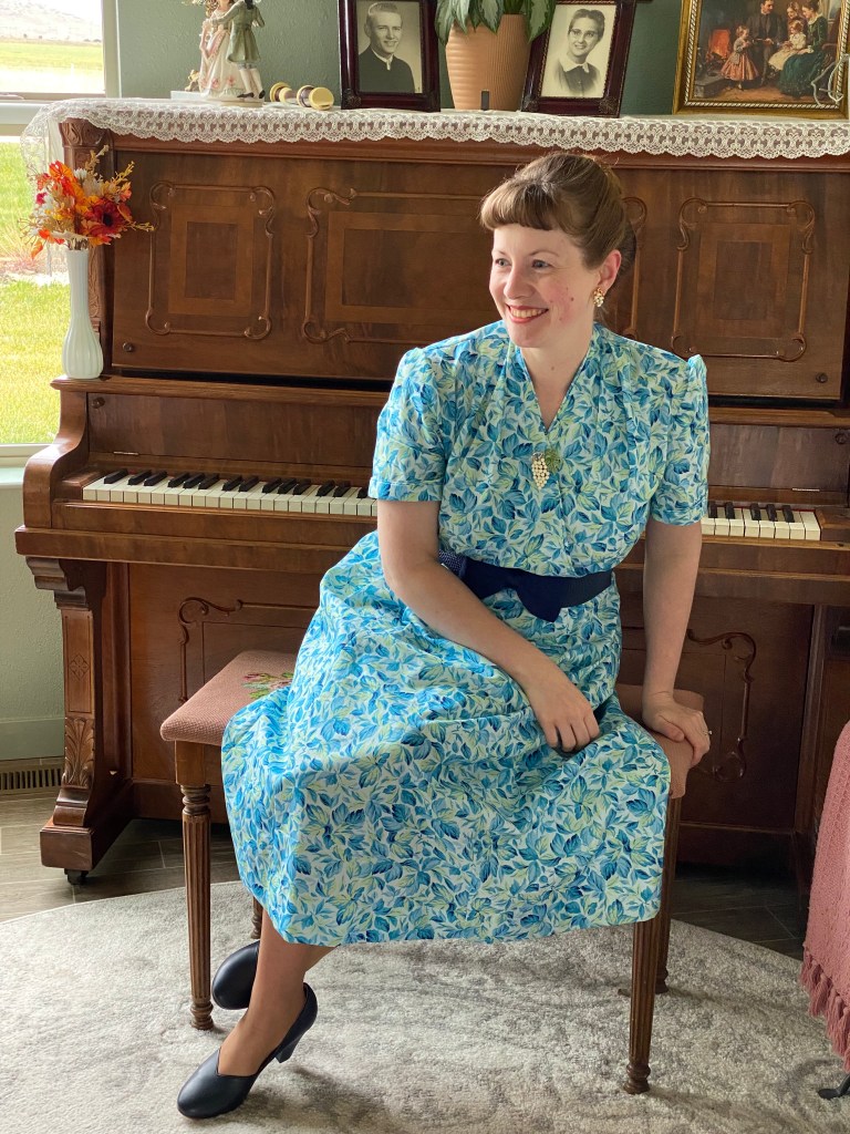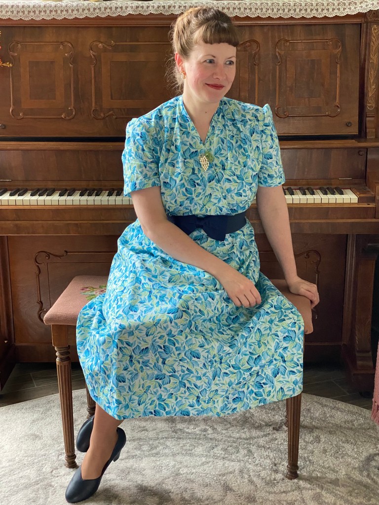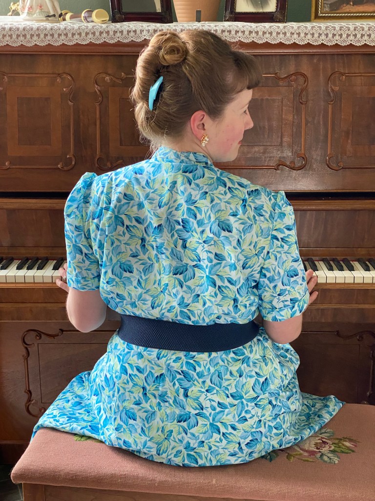 I’ve intended to make a 1950s dress with this blue leaf print for over a year, and it finally happened! This was the 2nd of the 2 fall dresses I sewed in November, and was the one I wore for our family’s Thanksgiving Day celebration this year.