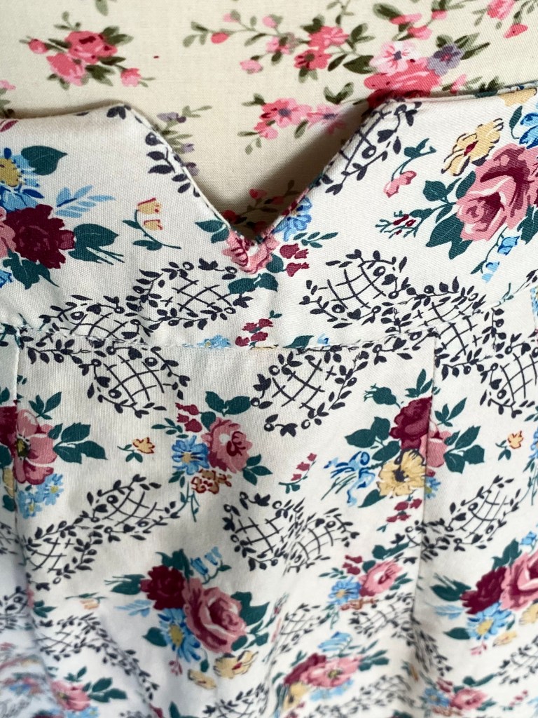 I’ll bet you won’t guess what I used for interfacing to keep the waistband rigid! I thought of buckram at first but I didn’t want to launder that, so I ended up using some plastic canvas cut to the V shape and inserted between seams. It works like a charm – super stiff and no creases when worn, but also flexible & washable.